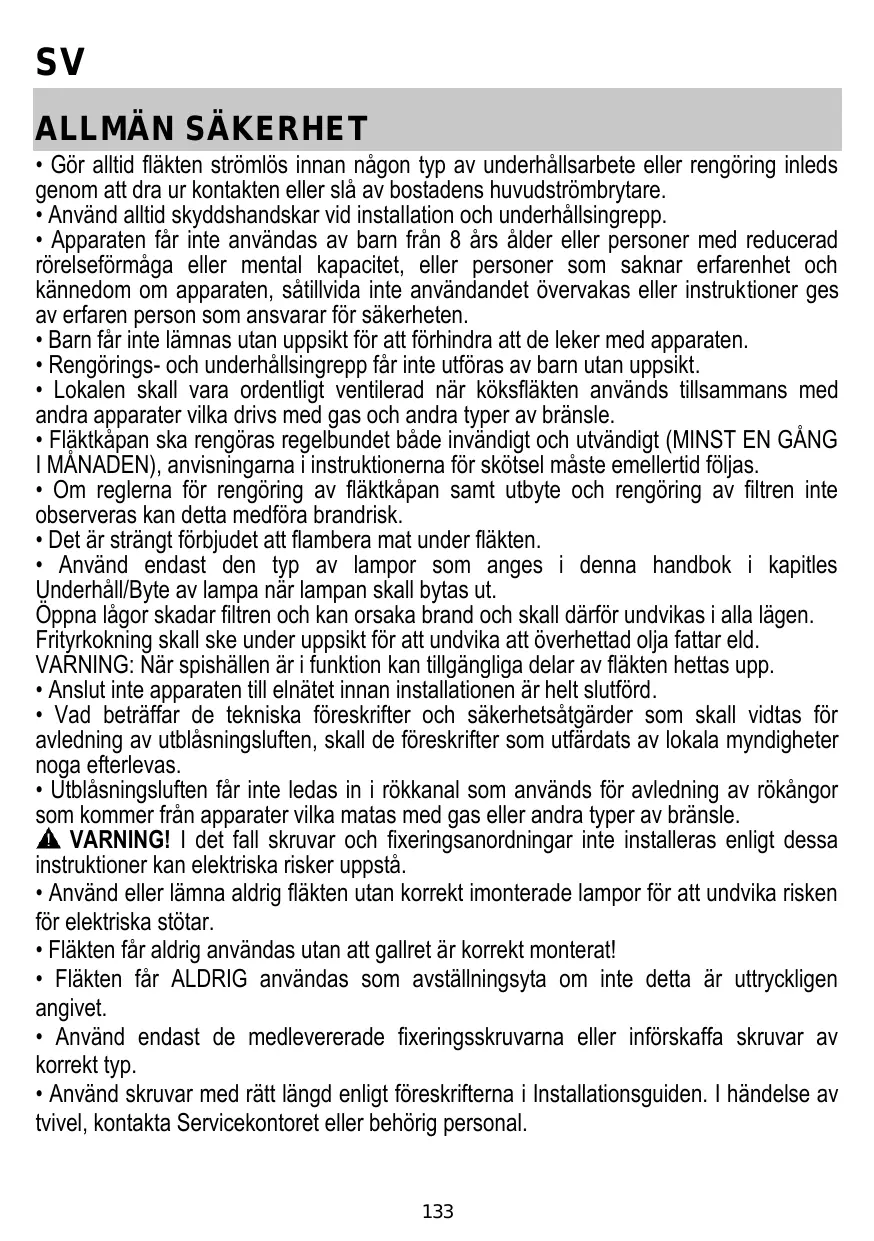 • Les enfants ne doivent pas jouer avec l’appareil. • Le nettoyage et l’entretien par l’usager ne doivent pas être effectués par des enfants sans surveillance. • La pièce doit avoir une aération suffisante lorsque la hotte est utilisée conjointement avec d'autres appareils fonctionnant au gaz ou autres combustibles. • La hotte doit être régulièrement nettoyée à la fois à l'intérieur et à l'extérieur (AU MOINS UNE FOIS PAR MOIS); cela devrait se faire en conformité avec les instructions d'entretien. Le non respect des instructions expressément fournies concernant le nettoyage de la hotte et des filtres peut provoquer des risques d'incendie. • Ne pas flamber d’aliments sous la hotte. • Pour le remplacement de la lampe, utilisez uniquement le type de lampe spécifié dans la section remplacement/maintenance lampe dans ce manuel. L'utilisation d'une flamme nue est dommageable pour les filtres et peut causer un incendie, par conséquent, il est déconseillé de l'utiliser. La friture doit être faite avec soin afin de s’assurer que l’huile surchauffée ne prenne pas feu. AVERTISSEMENT: Lorsque la table de cuisson est en fonctionnement, les parties accessibles de la hotte peuvent devenir très chaudes. • Ne pas brancher l'appareil au réseau électrique avant que l'installation ne soit complètement terminée. • En ce qui concerne les mesures techniques et de sécurité à prendre pour l'évacuation des fumées, respectez strictement les dispositions des règlements locales. • L’air ne doit pas être envoyé dans un conduit utilisé pour évacuer les fumées d’appareils utilisant du gaz ou un autre combustible. ATTENTION ! Le défaut d'installer les vis et les dispositifs de fixation conformément à ces instructions peut entraîner des risques électriques. • Ne pas utiliser ou laisser la hotte sans les lampes correctement montées, car un éventuel risque de choc électrique est possible. • N’utilisez jamais la hotte sans la grille montée correctement! • La hotte ne doit JAMAIS être utilisée comme une surface d'appui, sauf indication expresse. 21