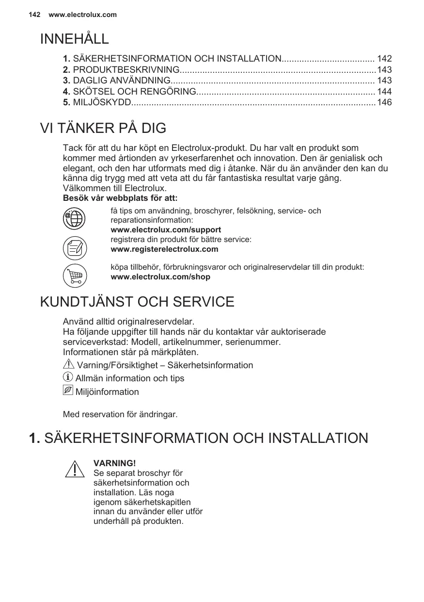 Tack för att du har köpt en Electrolux-produkt. Du har valt en produkt som kommer med årtionden av yrkeserfarenhet och innovation. Den är genialisk och elegant, och den har utformats med dig i åtanke. När du än använder den kan du känna dig trygg med att veta att du får fantastiska resultat varje gång. Välkommen till Electrolux. Besök vår webbplats för att: få tips om användning, broschyrer, felsökning, service- och reparationsinformation: www.electrolux.com/support registrera din produkt för bättre service: www.registerelectrolux.com köpa tillbehör, förbrukningsvaror och originalreservdelar till din produkt: www.electrolux.com/shop