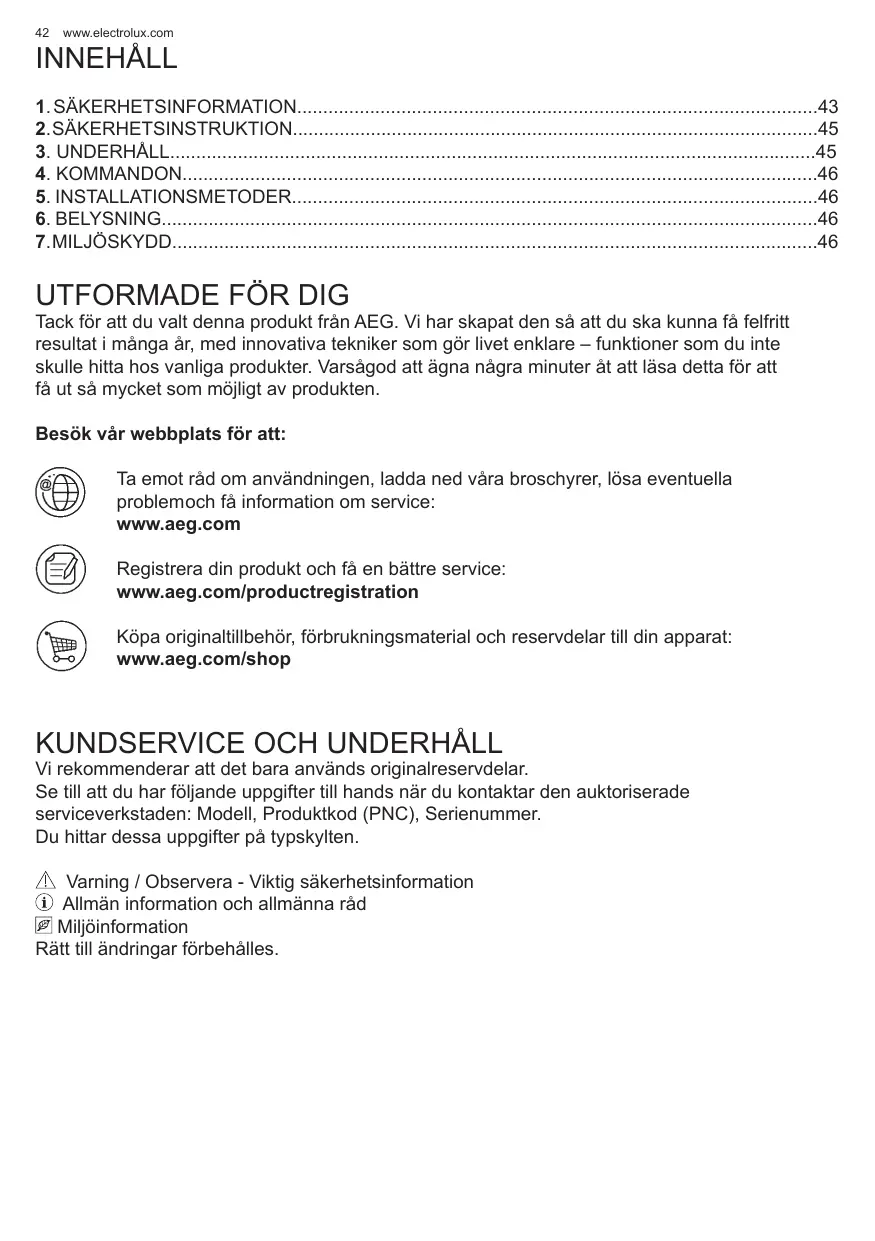 Lorsque vous contactez le Service Après-Vente agréé, munissez-vous des données suivantes : Modèle, Code produit (PNC), Numéro de série. Les informations se trouvent sur la plaque des données. Avertissement / Attention – Informations importantes pour la sécurité Conseils et suggestions Informations sur l’environnement Sous réserve de modifications.