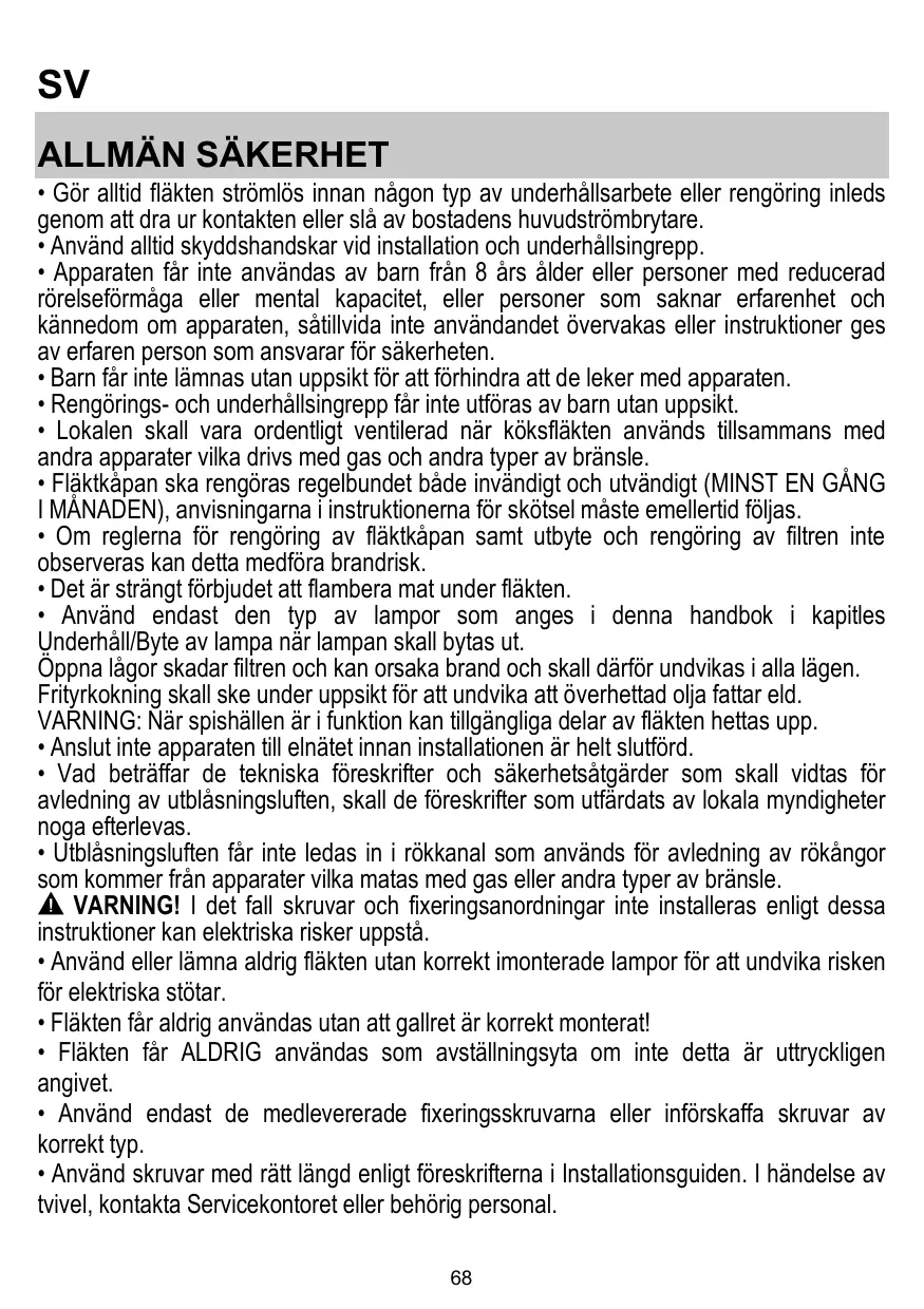 SV ALLMÄN SÄKERHET • Gör alltid fläkten strömlös innan någon typ av underhållsarbete eller rengöring inleds genom att dra ur kontakten eller slå av bostadens huvudströmbrytare. • Använd alltid skyddshandskar vid installation och underhållsingrepp. • Apparaten får inte användas av barn från 8 års ålder eller personer med reducerad rörelseförmåga eller mental kapacitet, eller personer som saknar erfarenhet och kännedom om apparaten, såtillvida inte användandet övervakas eller instruktioner ges av erfaren person som ansvarar för säkerheten. • Barn får inte lämnas utan uppsikt för att förhindra att de leker med apparaten. • Rengörings- och underhållsingrepp får inte utföras av barn utan uppsikt. • Lokalen skall vara ordentligt ventilerad när köksfläkten används tillsammans med andra apparater vilka drivs med gas och andra typer av bränsle. • Fläktkåpan ska rengöras regelbundet både invändigt och utvändigt (MINST EN GÅNG I MÅNADEN), anvisningarna i instruktionerna för skötsel måste emellertid följas. • Om reglerna för rengöring av fläktkåpan samt utbyte och rengöring av filtren inte observeras kan detta medföra brandrisk. • Det är strängt förbjudet att flambera mat under fläkten. • Använd endast den typ av lampor som anges i denna handbok i kapitles Underhåll/Byte av lampa när lampan skall bytas ut. Öppna lågor skadar filtren och kan orsaka brand och skall därför undvikas i alla lägen. Frityrkokning skall ske under uppsikt för att undvika att överhettad olja fattar eld. VARNING: När spishällen är i funktion kan tillgängliga delar av fläkten hettas upp. • Anslut inte apparaten till elnätet innan installationen är helt slutförd. • Vad beträffar de tekniska föreskrifter och säkerhetsåtgärder som skall vidtas för avledning av utblåsningsluften, skall de föreskrifter som utfärdats av lokala myndigheter noga efterlevas. • Utblåsningsluften får inte ledas in i rökkanal som används för avledning av rökångor som kommer från apparater vilka matas med gas eller andra typer av bränsle. VARNING! I det fall skruvar och fixeringsanordningar inte installeras enligt dessa instruktioner kan elektriska risker uppstå. • Använd eller lämna aldrig fläkten utan korrekt imonterade lampor för att undvika risken för elektriska stötar. • Fläkten får aldrig användas utan att gallret är korrekt monterat! • Fläkten får ALDRIG användas som avställningsyta om inte detta är uttryckligen angivet. • Använd endast de medlevererade fixeringsskruvarna eller införskaffa skruvar av korrekt typ. • Använd skruvar med rätt längd enligt föreskrifterna i Installationsguiden. I händelse av tvivel, kontakta Servicekontoret eller behörig personal. 68