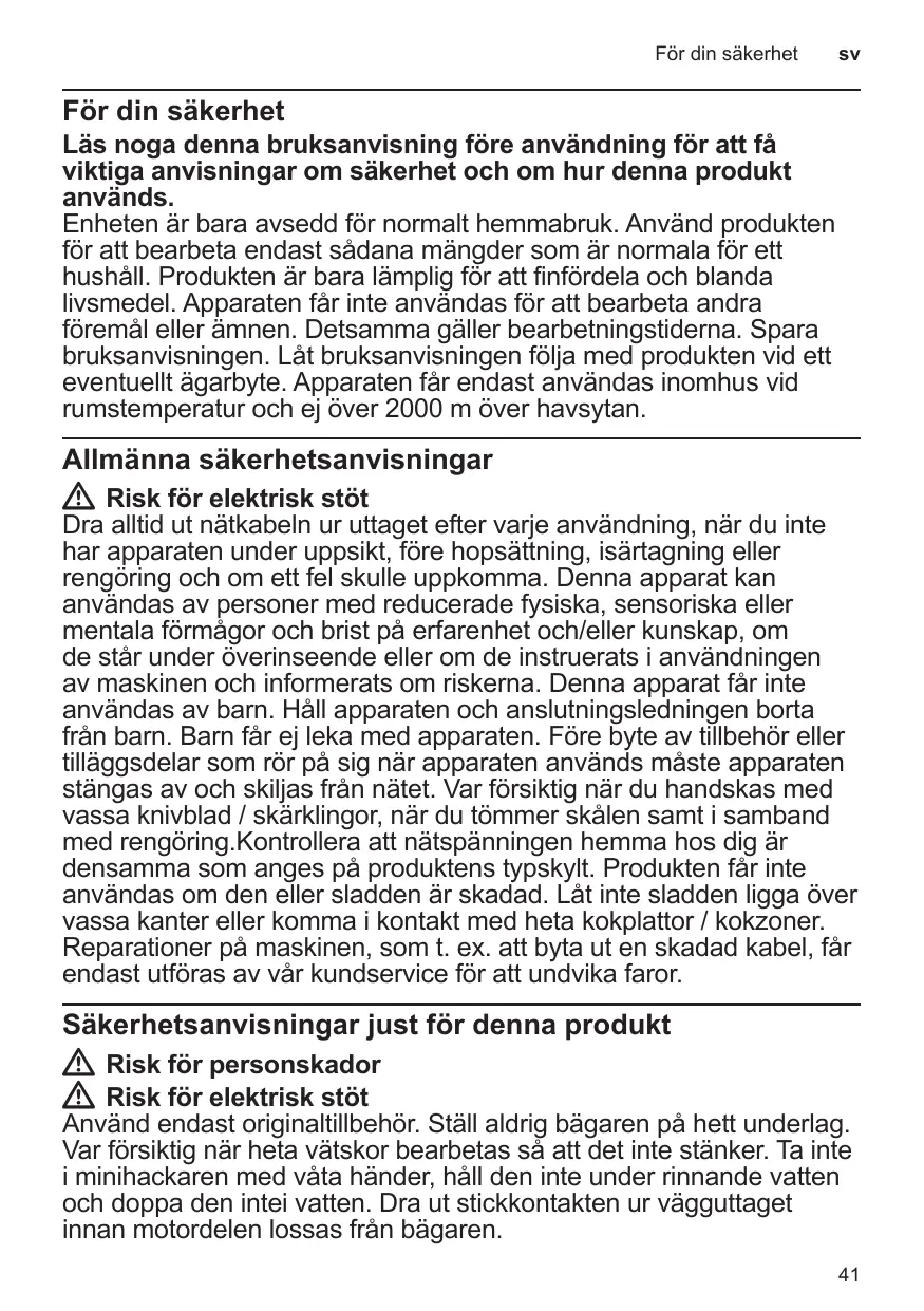 För din säkerhet���������������������������������������41 Allmänna säkerhetsanvisningar���������������41 Säkerhetsanvisningar just för denna produkt������������������������������������������41 Översiktsbilderna��������������������������������������42 Montering och start�����������������������������������43 Efter arbetet����������������������������������������������43 Rengöring�������������������������������������������������43 Praktiska tips och recept��������������������������43 Avfallshantering����������������������������������������45 Konsumentbestämmelser�������������������������45 Användningsexempel�������������������������������45 Denna bruksanvisning gäller för flera varianter av produkten.