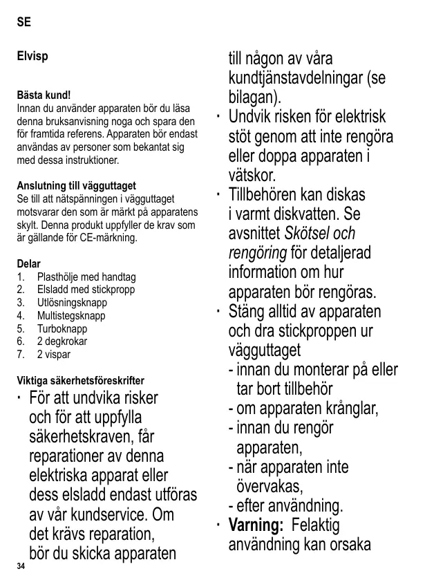 SE Elvisp Bästa kund! Innan du använder apparaten bör du läsa denna bruksanvisning noga och spara den för framtida referens. Apparaten bör endast användas av personer som bekantat sig med dessa instruktioner. Anslutning till vägguttaget Se till att nätspänningen i vägguttaget motsvarar den som är märkt på apparatens skylt. Denna produkt uppfyller de krav som är gällande för CE-märkning. Delar 1. Plasthölje med handtag 2. Elsladd med stickpropp 3. Utlösningsknapp 4. Multistegsknapp 5. Turboknapp 6. 2 degkrokar 7. 2 vispar