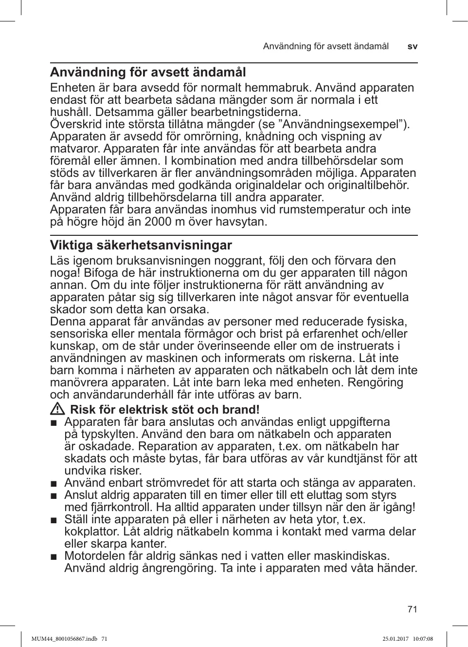 Overskrid inte stôrsta tillätna mängder (se "’Användningsexempel”). Apparaten är avsedd für omrôrning, knädning och vispning av matvaror. Apparaten fàr inte användas für att bearbeta andra fôremäl eller ämnen. | kombination med andra tillbehôrsdelar som stôds av tillverkaren är fler användningsomräden müjliga. Apparaten fàr bara användas med godkända originaldelar och originaltilbehôür. Använd aldrig tillbehôrsdelarna till andra apparater.
