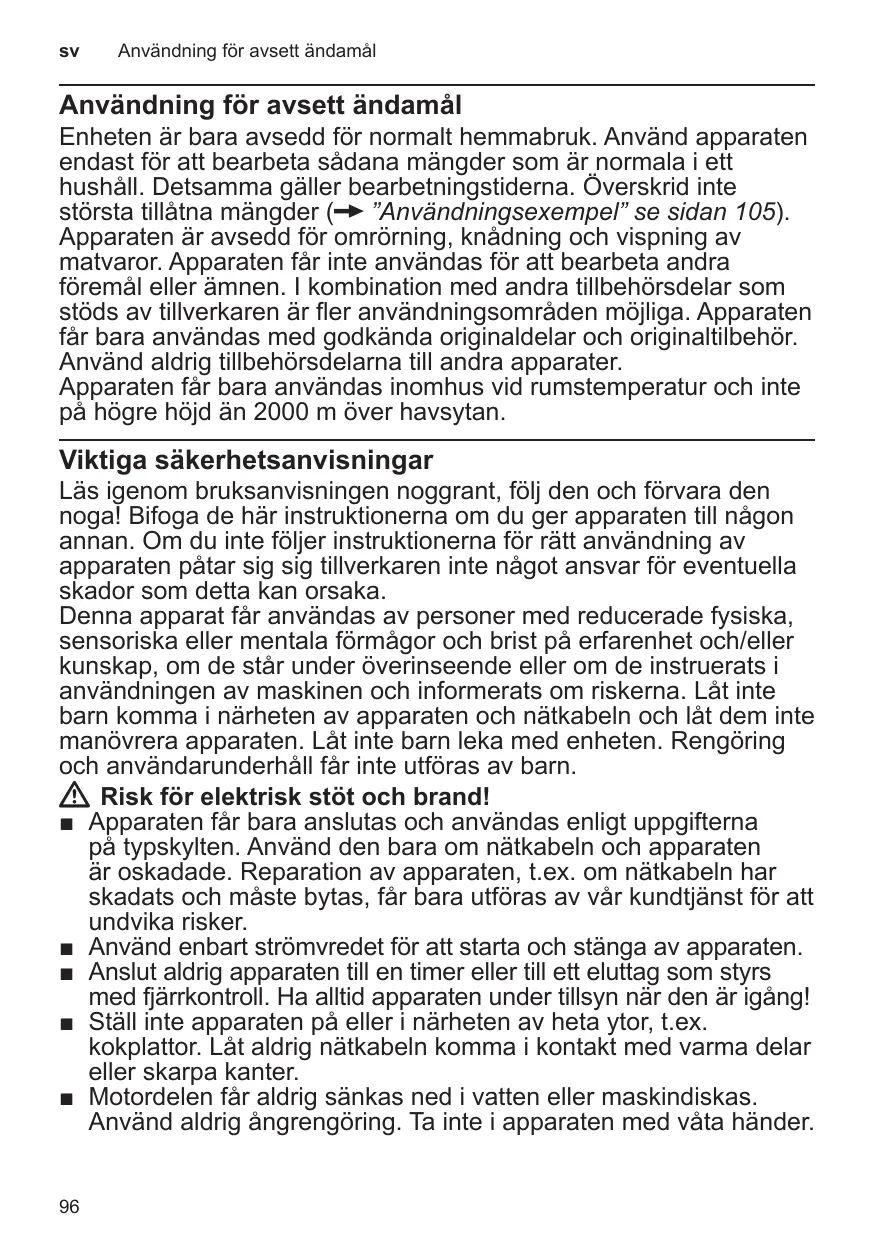 Enheten är bara avsedd för normalt hemmabruk. Använd apparaten endast för att bearbeta sådana mängder som är normala i ett hushåll. Detsamma gäller bearbetningstiderna. Överskrid inte största tillåtna mängder (X ”Användningsexempel” se sidan 105). Apparaten är avsedd för omrörning, knådning och vispning av matvaror. Apparaten får inte användas för att bearbeta andra föremål eller ämnen. I kombination med andra tillbehörsdelar som stöds av tillverkaren är fler användningsområden möjliga. Apparaten får bara användas med godkända originaldelar och originaltilbehör. Använd aldrig tillbehörsdelarna till andra apparater. Apparaten får bara användas inomhus vid rumstemperatur och inte på högre höjd än 2000 m över havsytan.