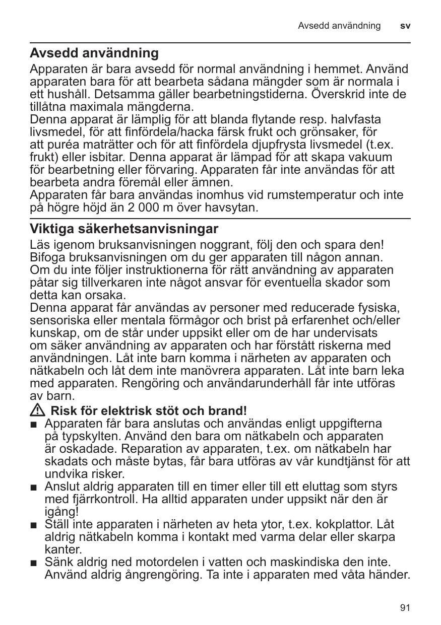 Läs igenom bruksanvisningen noggrant, följ den och spara den! Bifoga bruksanvisningen om du ger apparaten till någon annan. Om du inte följer instruktionerna för rätt användning av apparaten påtar sig tillverkaren inte något ansvar för eventuella skador som detta kan orsaka. Denna apparat får användas av personer med reducerade fysiska, sensoriska eller mentala förmågor och brist på erfarenhet och/eller kunskap, om de står under uppsikt eller om de har undervisats om säker användning av apparaten och har förstått riskerna med användningen. Låt inte barn komma i närheten av apparaten och nätkabeln och låt dem inte manövrera apparaten. Låt inte barn leka med apparaten. Rengöring och användarunderhåll får inte utföras av barn. WW Risk för elektrisk stöt och brand! ■■ Apparaten får bara anslutas och användas enligt uppgifterna på typskylten. Använd den bara om nätkabeln och apparaten är oskadade. Reparation av apparaten, t.ex. om nätkabeln har skadats och måste bytas, får bara utföras av vår kundtjänst för att undvika risker. ■■ Anslut aldrig apparaten till en timer eller till ett eluttag som styrs med fjärrkontroll. Ha alltid apparaten under uppsikt när den är igång! ■■ Ställ inte apparaten i närheten av heta ytor, t.ex. kokplattor. Låt aldrig nätkabeln komma i kontakt med varma delar eller skarpa kanter. ■■ Sänk aldrig ned motordelen i vatten och maskindiska den inte. Använd aldrig ångrengöring. Ta inte i apparaten med våta händer. 91