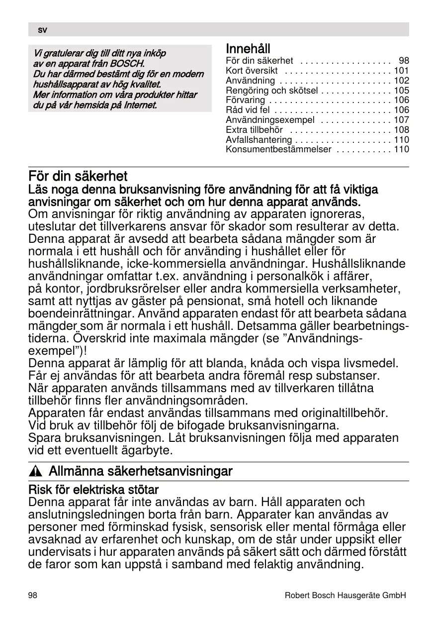 Vi gratulerar dig till ditt nya inköp av en apparat från BOSCH. Du har därmed bestämt dig för en modern hushållsapparat av hög kvalitet. Mer information om våra produkter hittar du på vår hemsida på Internet. Innehåll För din säkerhet . . . . . . . . . . . . . . . . . . Kort översikt . . . . . . . . . . . . . . . . . . . . . Användning . . . . . . . . . . . . . . . . . . . . . . Rengöring och skötsel . . . . . . . . . . . . . . Förvaring . . . . . . . . . . . . . . . . . . . . . . . . Råd vid fel . . . . . . . . . . . . . . . . . . . . . . . Användningsexempel . . . . . . . . . . . . . . Extra tillbehör . . . . . . . . . . . . . . . . . . . . Avfallshantering . . . . . . . . . . . . . . . . . . . Konsumentbestämmelser . . . . . . . . . . .