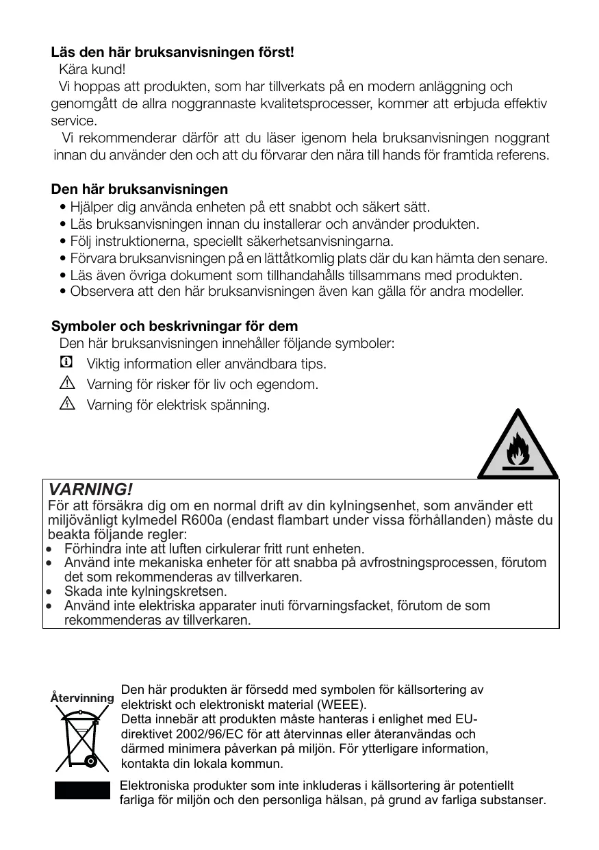 Om produktens kylsystem innehåller R600a: Den här gasen är lättantändlig. Var därför noggrann så att du inte skadar kylsystemet och rören under användning och transport. Om det skulle uppstå någon skada skall produkten hållas borta från potentiella eldkällor som kan göra att produkten fattar eld och du ska ventilera rummet där enheten är placerad. Du kan bortse från den här varningen om produktens kylsystem innehåller R134a. Typen av gas som används i produkten anges på märkplåten som sitter på kylskåpets vänstra insida. Kasta aldrig produkten i eld när den ska kasseras.