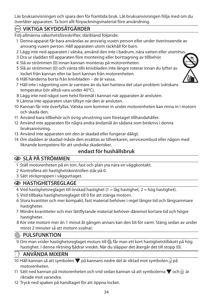 2 N’immergez pas l’appareil dans un liquide, ne l’utilisez pas dans une salle de bains, à proximité d’une source d’eau ou à l’extérieur. 3 Débranchez l’appareil avant d’adapter ou de retirer les accessoires. 4 Eteignez (0) avant de mettre le bol en place sur le bloc moteur. 5 Eteignez (0) et attendez jusqu’à ce que les lames s’arrêtent avant d’enlever le couvercle du bol ou avant d’enlever le bol du bloc moteur. 6 Tenez vos mains à l’écart des lames – elles sont tranchantes 7 Ne remplissez pas avec quelque chose de trop chaud qui n’est plus agréable au toucher pour vous (par ex. températures des liquides inférieures à 40°C). 8 Ne placez aucun ustensile dans le bol lorsque l’appareil est branché. 9 Ne laissez pas l’appareil sans surveillance lorsqu’il est branché. 10 Veillez à ce que le bol ne déborde pas. Tout liquide qui se met sous le bloc moteur pourrait être absorbé par le moteur et risquerait de l’endommager. 11 N’adaptez pas d’accessoires autres que ceux fournis. 12 N’utilisez pas l’appareil à d’autres fins que celles décrites dans ce mode d’emploi. 13 N’utilisez pas l’appareil s’il est endommagé ou ne fonctionne pas correctement. 14 Si le câble est abîmé, vous devez le faire remplacer par le fabricant, un de ses techniciens agréés ou une personne également qualifiée, pour éviter tout danger.