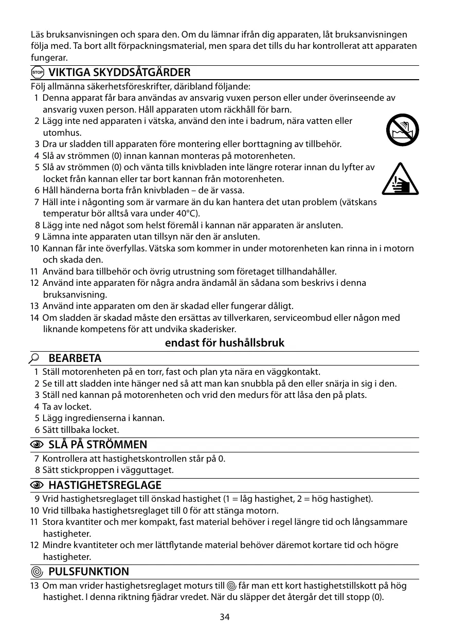 2 N’immergez pas l’appareil dans un liquide, ne l’utilisez pas dans une salle de bains, à proximité d’une source d’eau ou à l’extérieur. 3 Débranchez l’appareil avant d’adapter ou de retirer les accessoires. 4 Eteignez (0) avant de mettre le bol en place sur le bloc moteur. 5 Eteignez (0) et attendez jusqu’à ce que les lames s’arrêtent avant d’enlever le couvercle du bol ou avant d’enlever le bol du bloc moteur. 6 Tenez vos mains à l’écart des lames – elles sont tranchantes 7 Ne remplissez pas avec quelque chose de trop chaud qui n’est plus agréable au toucher pour vous (par ex. températures des liquides inférieures à 40°C). 8 Ne placez aucun ustensile dans le bol lorsque l’appareil est branché. 9 Ne laissez pas l’appareil sans surveillance lorsqu’il est branché. 10 Veillez à ce que le bol ne déborde pas. Tout liquide qui se met sous le bloc moteur pourrait être absorbé par le moteur et risquerait de l’endommager. 11 N’installez que des accessoires et des pièces de rechange qui proviennent du fabricant. 12 N’utilisez pas l’appareil dans un autre but que celui décrit dans ces instructions. 13 N’utilisez pas l’appareil s’il est endommagé ou ne fonctionne pas correctement. 14 Si le câble est abîmé, vous devez le faire remplacer par le fabricant, un de ses techniciens agréés ou une personne également qualifiée, pour éviter tout danger.
