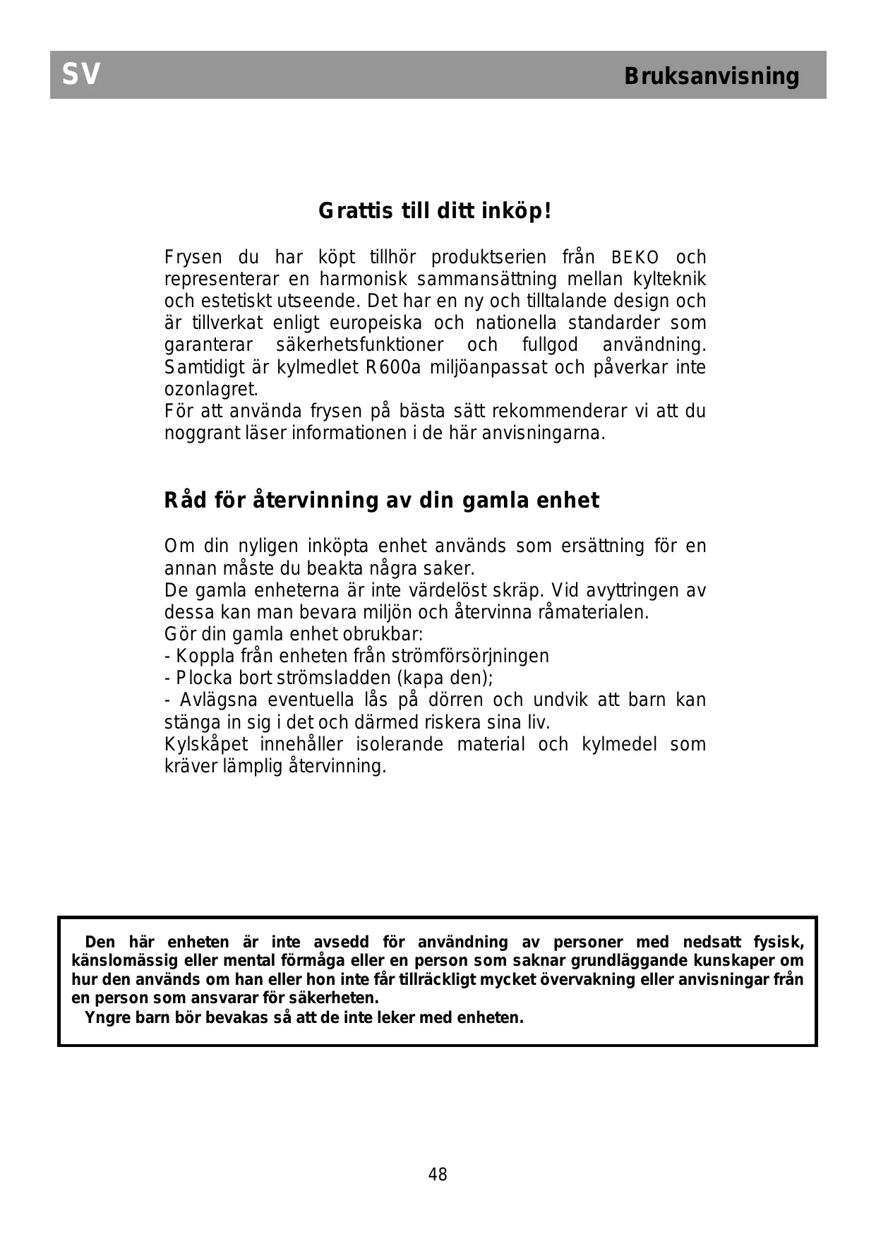 Grattis till ditt inköp! Frysen du har köpt tillhör produktserien från BEKO och representerar en harmonisk sammansättning mellan kylteknik och estetiskt utseende. Det har en ny och tilltalande design och är tillverkat enligt europeiska och nationella standarder som garanterar säkerhetsfunktioner och fullgod användning. Samtidigt är kylmedlet R600a miljöanpassat och påverkar inte ozonlagret. För att använda frysen på bästa sätt rekommenderar vi att du noggrant läser informationen i de här anvisningarna.