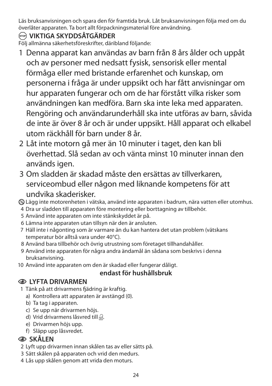 Le nettoyage et l'entretien par l'utilisateur ne doivent pas être effectués par des enfants, à moins qu'ils ne soient âgés de plus de 8 ans et qu'ils soient supervisés. Tenez l'appareil et le câble hors de portée des enfants de moins de 8 ans. 2 Ne pas faire fonctionner l’appareil en continu au-delà de 10 minutes afin d’éviter une surchauffe. Si nécessaire, laisser reposer l’appareil pendant au moins 10 minutes pour laisser refroidir le moteur. 3 Si le câble est abîmé, vous devez le faire remplacer par le fabricant, un de ses techniciens agréés ou une personne également qualifiée, pour éviter tout danger.