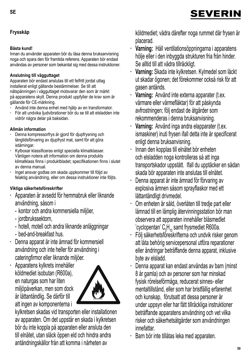 köldmediet; vädra därefter noga rummet där frysen är placerad. Varning: Håll ventilationsöppningarna i apparatens hölje eller i den inbyggda strukturen fria från hinder. Se alltid till att vädra tillräckligt. Varning: Skada inte kylkretsen. Kylmedel som läckt ut skadar ögonen; det förekommer också risk för att gasen antänds. Varning: Använd inte externa apparater (t.ex. värmare eller värmefläktar) för att påskynda avfrostningen; följ endast de åtgärder som rekommenderas i denna bruksanvisning. Varning: Använd inga andra elapparater (t.ex. ismaskiner) inuti frysen ifall detta inte är specificerat enligt denna bruksanvisning. Innan den kopplas till elnätet bör enheten och elsladden noga kontrolleras så att inga transportskador uppstått. Ifall du upptäcker en sådan skada bör apparaten inte anslutas till elnätet. Denna apparat är inte ämnad för förvaring av explosiva ämnen såsom sprayflaskor med ett lättantändligt drivmedel. Om enheten är såld, överlåten till tredje part eller lämnad till en lämplig återvinningsstation bör man observera att apparaten innehåller blåsmedlet ’cyclopentan’ C5H10 samt frysmediet R600a. Följ säkerhetsföreskrifterna och undvik risker genom att låta behörig servicepersonal utföra reparationer eller ändringar beträffande denna apparat, inklusive byte av elsladd. Denna apparat kan endast användas av barn (minst 8 år gamla) och av personer som har minskad fysisk rörelseförmåga, reducerat sinnes- eller mentaltillstånd, eller som har bristfällig erfarenhet och kunskap, förutsatt att dessa personer är under uppsyn eller har fått tillräckliga instruktioner beträffande apparatens användning och vet vilka risker och säkerhetsåtgärder som användningen innefattar. Barn bör inte tillåtas leka med apparaten. 59