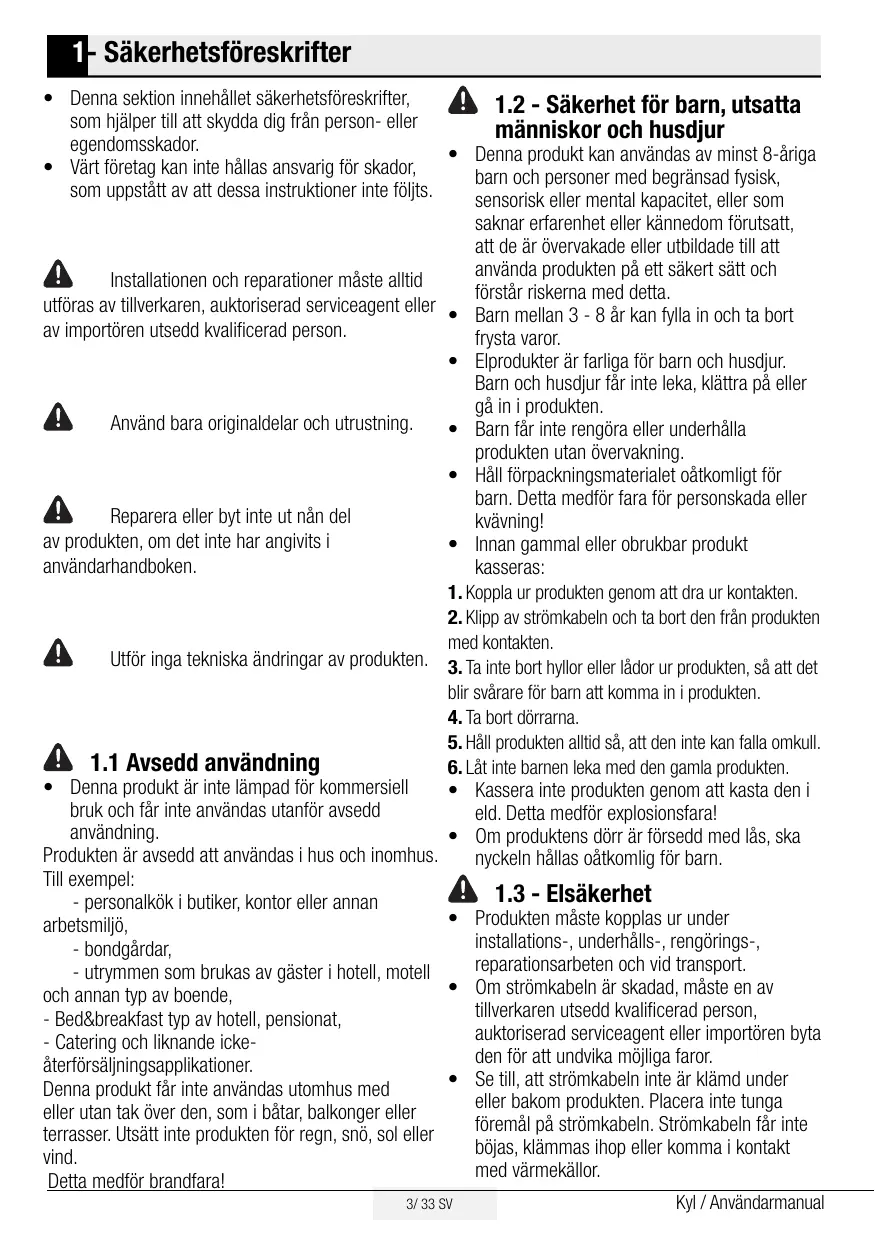 1. Koppla ur produkten genom att dra ur kontakten. 2. Klipp av strömkabeln och ta bort den från produkten med kontakten. Utför inga tekniska ändringar av produkten. 3. Ta inte bort hyllor eller lådor ur produkten, så att det blir svårare för barn att komma in i produkten. 4. Ta bort dörrarna. 5. Håll produkten alltid så, att den inte kan falla omkull. 1.1 Avsedd användning 6. Låt inte barnen leka med den gamla produkten.