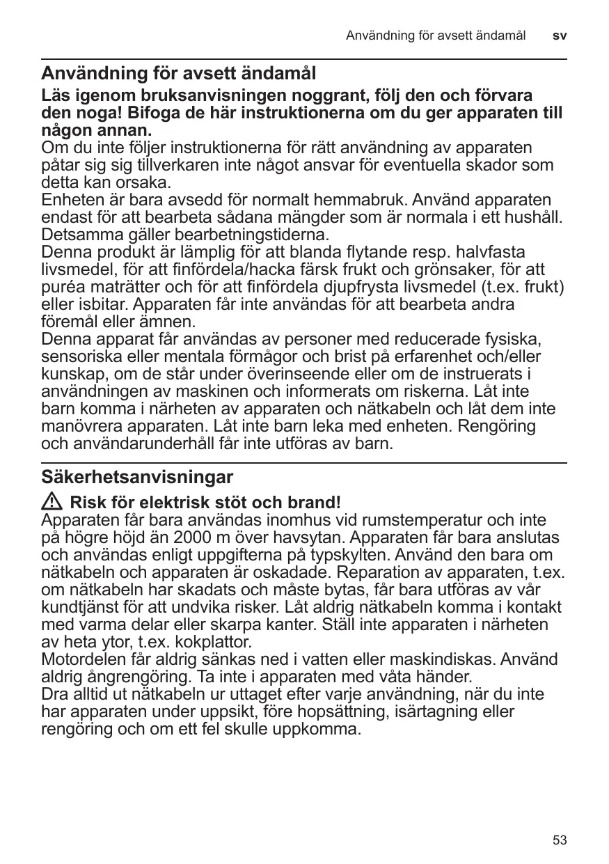 Cet appareil est destiné exclusivement à une utilisation domestique et non professionnelle. Utiliser cet appareil uniquement pour des quantités de préparations culinaires courantes et pour des durées de service normales. Cet appareil convient pour mélanger les produits alimentaires liquides et mi-durs, à broyer / hacher les fruits et légumes crus, à réduire les préparations en purée et pour broyer les produits alimentaires surgelés (les fruits par exemple) ou les glaçons. L’appareil ne doit pas servir à transformer d’autres substances ou objets. Cet appareil peut être utilisé par des personnes aux capacités physiques, sensorielles ou mentales réduites ou des personnes inexpérimentées, à condition qu’elles soient surveillées ou qu’elles aient été informées de l’utilisation sûre de l’appareil et qu’elles comprennent les risques inhérents à son usage. Il faut tenir les enfants à l’écart de l’appareil et du cordon de branchement et ne pas leur permettre d’utiliser l’appareil. Ne pas laisser les enfants jouer avec l’appareil. Le nettoyage et l’entretien incombant à l’utilisateur ne doivent pas être effectués par des enfants.