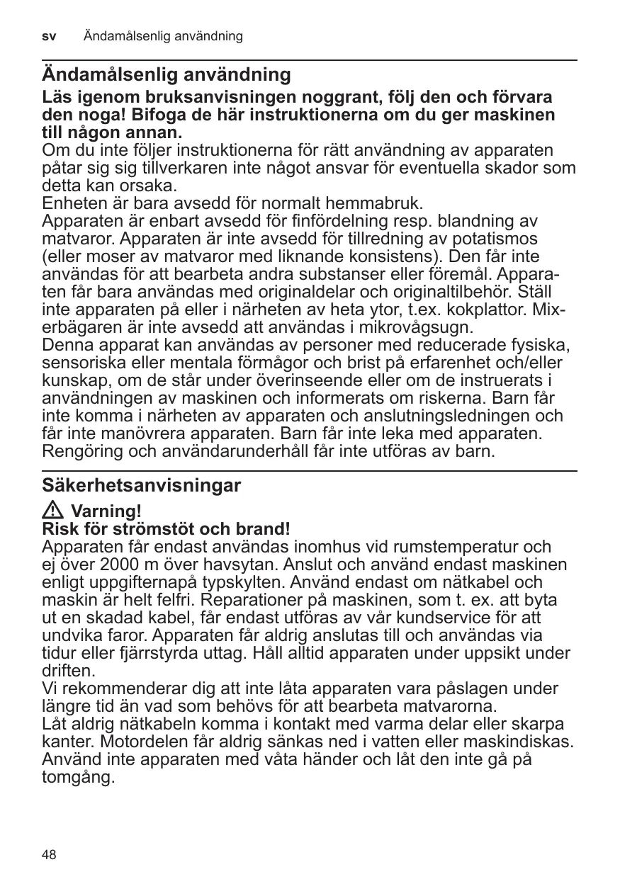 Cet appareil est destiné exclusivement à une utilisation domestique et non professionnelle. L’appareil ne convient que pour broyer et / ou mélanger des produits alimentaires. L’appareil n’est pas adapté pour la préparation de purée de pommes de terre (ou de purées d’aliments de consistance similaire). Il ne doit pas servir à transformer d’autres substances / objets. Utiliser l’appareil avec les pièces et accessoires d’origine uniquement. Ne jamais poser l’appareil sur des surfaces chaudes (tables de cuisson par ex.) ou à proximité de celles-ci. Le bol mixeur ne va pas au four micro-ondes. Cet appareil peut être utilisé par des personnes aux capacités physiques, sensorielles ou mentales réduites ou des personnes inexpérimentées, à condition qu’elles soient surveillées ou qu’elles aient été informées de l’utilisation de l’appareil et qu’elles comprennent les risques inhérents à son usage. Il faut tenir les enfants à l’écart de l’appareil et du cordon de branchement et ne pas leur permettre d’utiliser l’appareil. Ne pas laisser les enfants jouer avec l’appareil. Le nettoyage et l’entretien incombant à l’utilisateur ne doivent pas être effectués par des enfants.