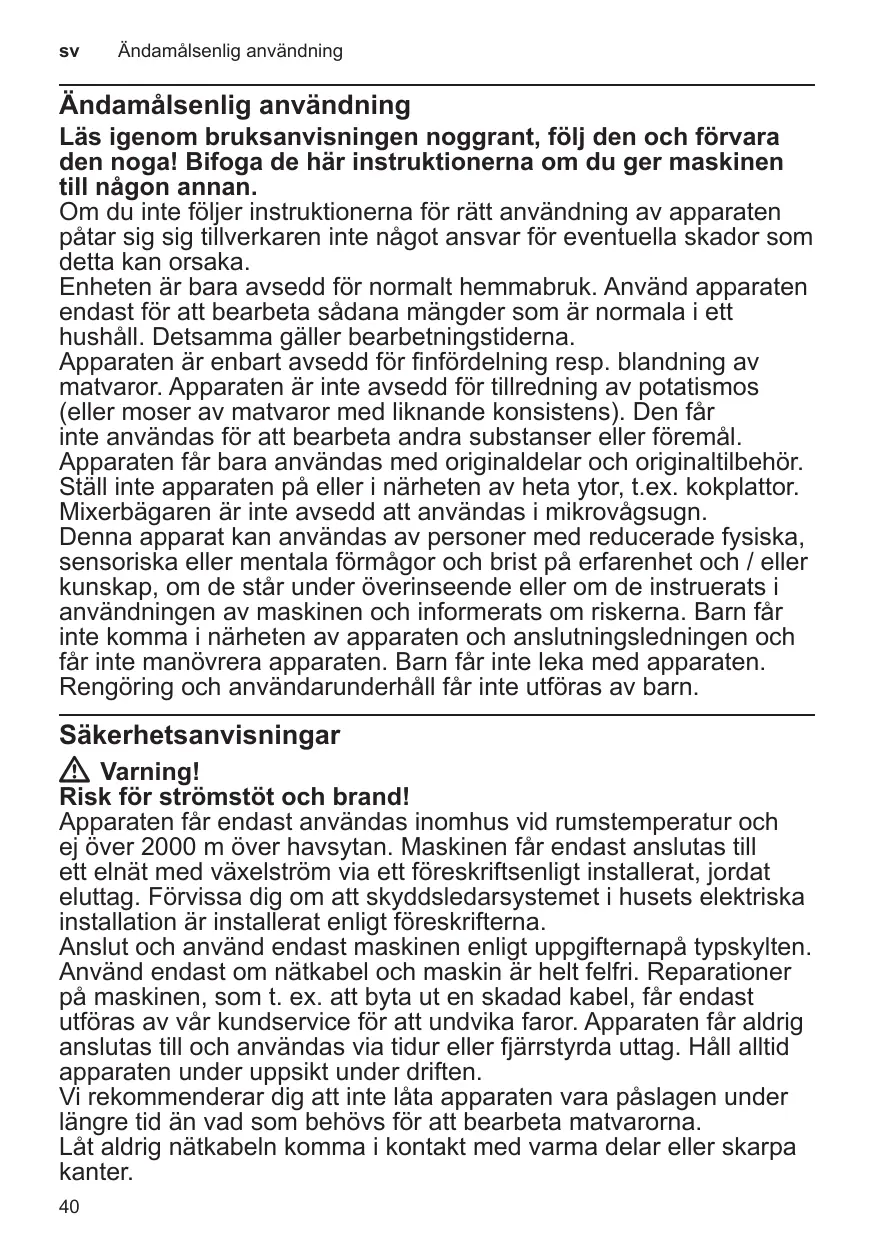 Cet appareil est destiné exclusivement à une utilisation domestique et non professionnelle. Utiliser cet appareil uniquement pour des quantités de préparations culinaires courantes et pour des durées de service normales. L’appareil ne convient que pour broyer et / ou mélanger des produits alimentaires. L’appareil n’est pas adapté pour la préparation de purée de pommes de terre (ou de purées d’aliments de consistance similaire). Il ne doit pas servir à transformer d’autres substances / objets. Utiliser l’appareil avec les pièces et accessoires d’origine uniquement. Ne jamais poser l’appareil sur des surfaces chaudes (tables de cuisson par ex.) ou à proximité de celles-ci. Le bol mixeur ne va pas au four micro-ondes. Cet appareil peut être utilisé par des personnes aux capacités physiques, sensorielles ou mentales réduites ou des personnes inexpérimentées, à condition qu’elles soient surveillées ou qu’elles aient été informées de l’utilisation de l’appareil et qu’elles comprennent les risques inhérents à son usage. Il faut tenir les enfants à l’écart de l’appareil et du cordon de branchement et ne pas leur permettre d’utiliser l’appareil. Ne pas laisser les enfants jouer avec l’appareil. Le nettoyage et l’entretien incombant à l’utilisateur ne doivent pas être effectués par des enfants.