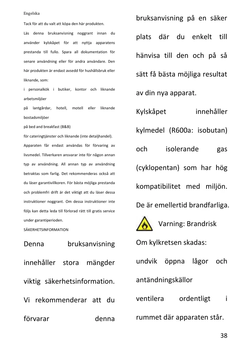 Nous vous suggérons de conserver ces instructions dans un endroit sûr pour une référence ultérieure aisée et une bonne utilisation de l'appareil. Ce réfrigérateur contient un gaz réfrigérant (R600a : isobutane) et un gaz isolant (cyclopentane), qui présentent une compatibilité élevée avec l'environnement mais des propriétés inflammables.
