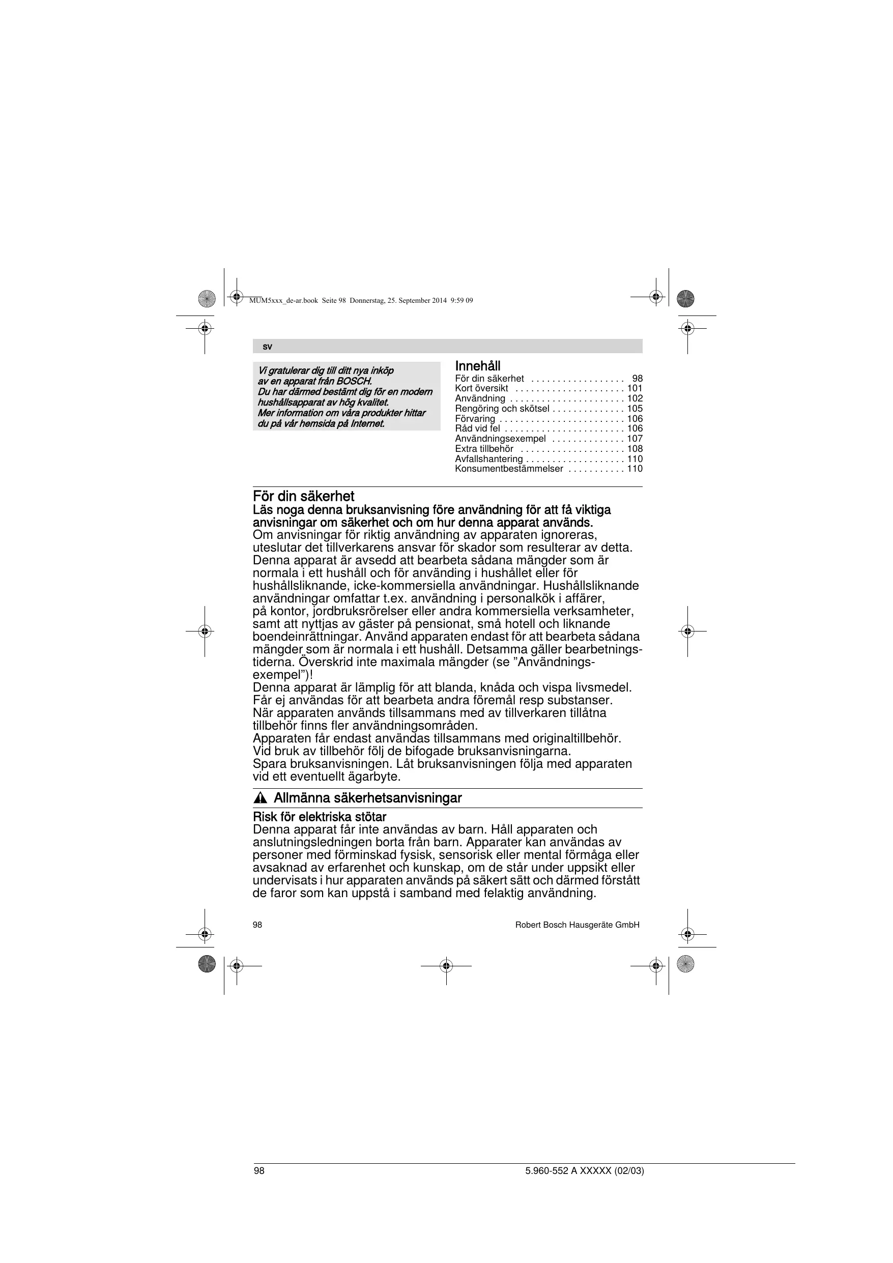 , Allmänna säkerhetsanvisningar Risk för elektriska stötar Denna apparat får inte användas av barn. Håll apparaten och anslutningsledningen borta från barn. Apparater kan användas av personer med förminskad fysisk, sensorisk eller mental förmåga eller avsaknad av erfarenhet och kunskap, om de står under uppsikt eller undervisats i hur apparaten används på säkert sätt och därmed förstått de faror som kan uppstå i samband med felaktig användning. 98