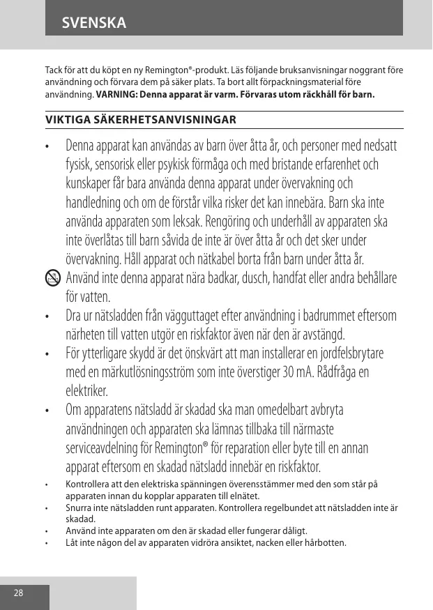 SVENSKA Tack för att du köpt en ny Remington®-produkt. Läs följande bruksanvisningar noggrant före användning och förvara dem på säker plats. Ta bort allt förpackningsmaterial före användning. VARNING: Denna apparat är varm. Förvaras utom räckhåll för barn.