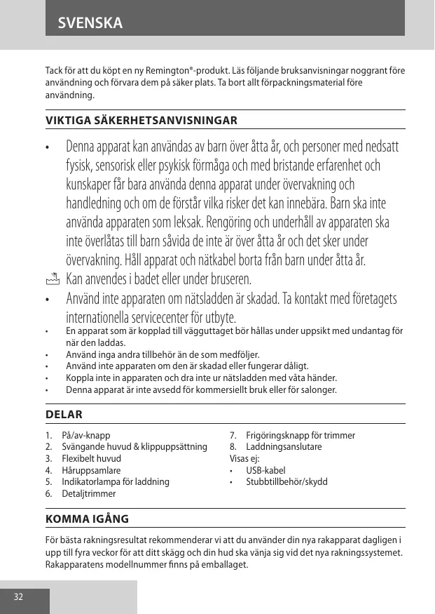 SVENSKA Tack för att du köpt en ny Remington®-produkt. Läs följande bruksanvisningar noggrant före användning och förvara dem på säker plats. Ta bort allt förpackningsmaterial före användning.