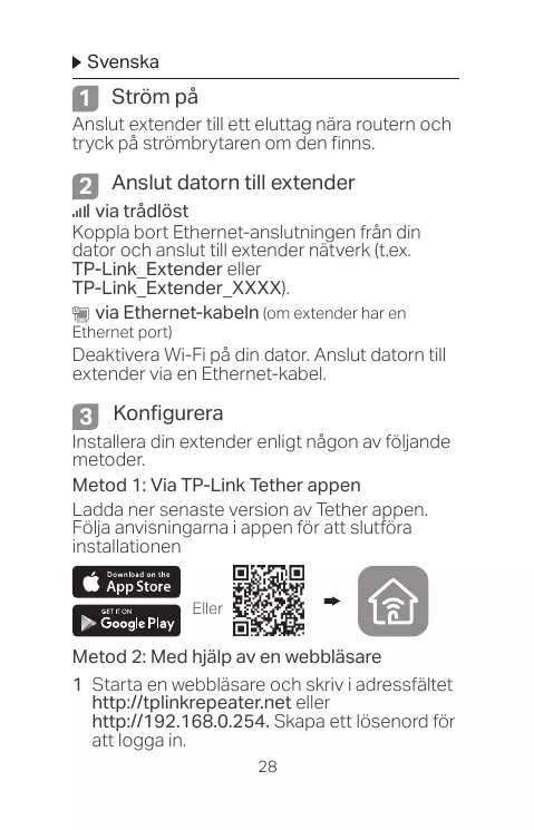 Svenska 1 Ström på Anslut extender till ett eluttag nära routern och tryck på strömbrytaren om den finns. 2 Anslut datorn till extender via trådlöst Koppla bort Ethernet-anslutningen från din dator och anslut till extender nätverk (t.ex. TP-Link_Extender eller TP-Link_Extender_XXXX). via Ethernet-kabeln (om extender har en Ethernet port) Deaktivera Wi-Fi på din dator. Anslut datorn till extender via en Ethernet-kabel. 3 Konfigurera Installera din extender enligt någon av följande metoder. Metod 1: Via TP-Link Tether appen Ladda ner senaste version av Tether appen. Följa anvisningarna i appen för att slutföra installationen Eller Metod 2: Med hjälp av en webbläsare 1 Starta en webbläsare och skriv i adressfältet http://tplinkrepeater.net eller http://192.168.0.254. Skapa ett lösenord för att logga in.