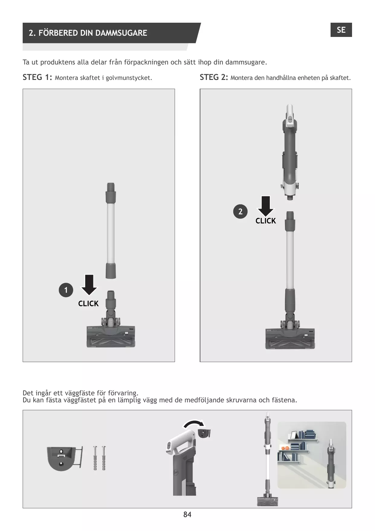 1. Avec l’appareil complètement monté en mode électrobrosse ou dans le support mural. 2. Avec l’appareil en mode manuel. 3. Chargez la batterie retirée de l’appareil.
