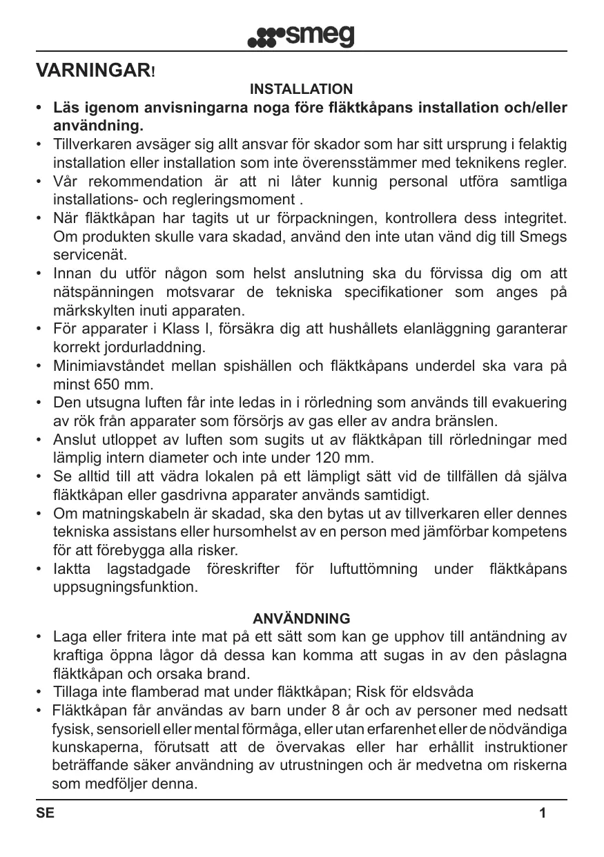Lorsque la hotte est enlevée de l'emballage, en vérifier son état. Si le produit est endommagé, ne pas l'utiliser et contacter le réseau d'assistance Smeg. Avant d'effectuer tout raccordement, s'assurer que la tension de réseau corresponde à la tension indiquée sur l'étiquette caractéristique située à l'intérieur de l'appareil. Pour les appareils de Classe I, vérifier que l'installation électrique domestique garantisse un déchargement à la terre correct. La distance minimum entre la plaque de cuisson et la partie inférieure de la hotte doit être d'au moins 650 mm. L’air aspiré ne doit pas être convoyé dans un conduit utilisé pour l’évacuation des fumées des appareils alimentés au gaz ou avec d’autres combustibles. Raccorder la sortie de l'air aspiré par la hotte aux conduits d'évacuation des fumées d'un diamètre interne adéquat et non inférieur à 120 mm. Prévoir toujours une aération adéquate du local lorsque la hotte ou les appareils à gaz sont utilisés en même temps. Si le câble d'alimentation est endommagé, il doit être remplacé par le fabricant ou par son service d'assistance technique ou de toute façon par une personne ayant une qualification similaire afin de prévenir tout risque. Respecter les prescriptions de lois concernant l'expulsion de l'air à évacuer dans le fonctionnement aspirant de la hotte.