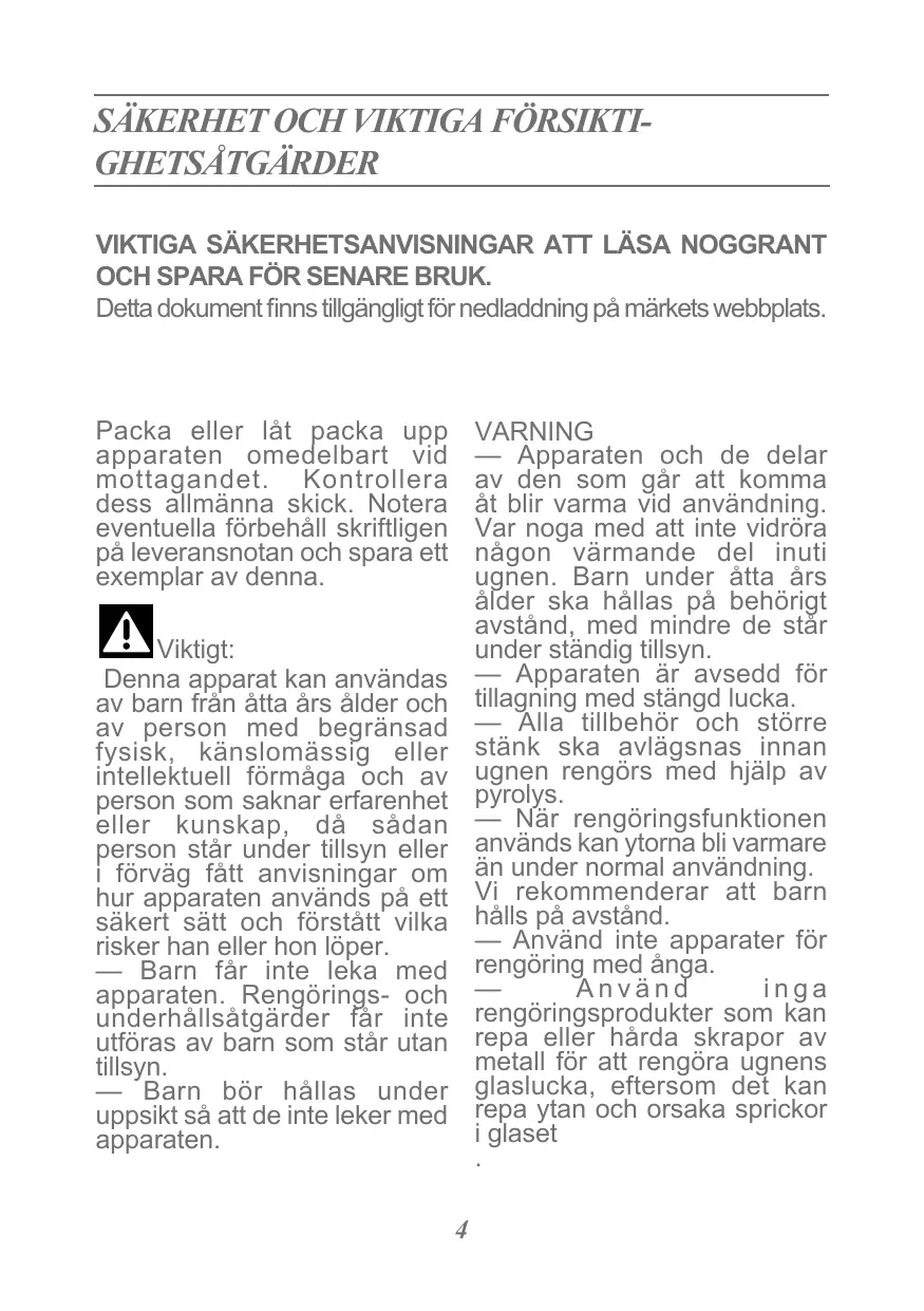 VARNING — Apparaten och de delar av den som går att komma åt blir varma vid användning. Var noga med att inte vidröra någon värmande del inuti ugnen. Barn under åtta års ålder ska hållas på behörigt avstånd, med mindre de står under ständig tillsyn. — Apparaten är avsedd för tillagning med stängd lucka. — Alla tillbehör och större stänk ska avlägsnas innan ugnen rengörs med hjälp av pyrolys. — När rengöringsfunktionen används kan ytorna bli varmare än under normal användning. Vi rekommenderar att barn hålls på avstånd. — Använd inte apparater för rengöring med ånga. — Använd inga rengöringsprodukter som kan repa eller hårda skrapor av metall för att rengöra ugnens glaslucka, eftersom det kan repa ytan och orsaka sprickor i glaset .