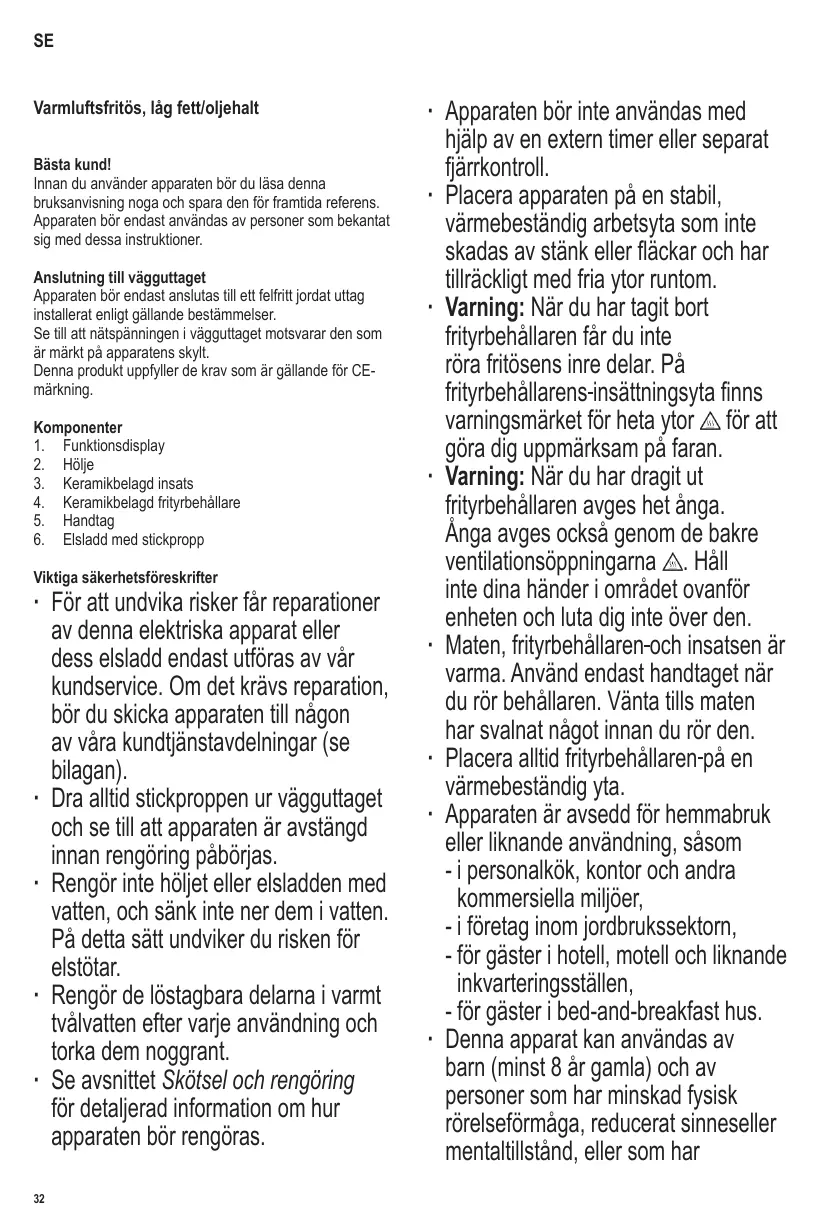 Placez l’appareil sur une surface de travail stable, résistant à la chaleur et ne craignant ni les éclaboussures ni les taches et suffisamment vaste. Attention : Une fois la cuve à friture retirée, ne pas toucher l’intérieur de la friteuse. L’espace d’insertion dans la cuve à friture affiche un symbole d’avertissement ‘Surfaces chaudes’ pour attirer votre attention sur le risque posé. Attention : Lorsque la cuve à friture est retirée, de la vapeur brûlante est émise. De la vapeur s’échappe également par les orifices de ventilation à l’arrière . Tenez vos mains éloignées de l’espace audessus de l’appareil et ne pas vous pencher au-dessus. Les aliments, la cuve à friture et le panier sont chauds. Utilisez uniquement la poignée pour prendre le panier à friture. Attendez que les aliments aient légèrement refroidi avant de les manipuler. Placez toujours la friteuse sur une surface résistant à la chaleur. Cet appareil est destiné à une utilisation domestique ou similaire, telle que - dans les cuisines pour personnel, dans des bureaux et autres locaux commerciaux, - dans des organisations agricoles,