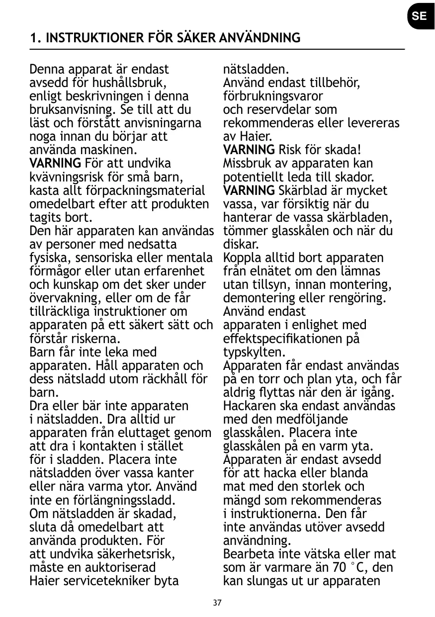 Monte el aparato con las cuchillas, la tapa y el cuerpo principal en su sitio. Guarde el aparato en su caja o en un lugar limpio y seco, fuera del alcance de los niños. 1. INSTRUKTIONER FÖR SÄKER ANVÄNDNING Denna apparat är endast avsedd för hushållsbruk, enligt beskrivningen i denna bruksanvisning. Se till att du läst och förstått anvisningarna noga innan du börjar att använda maskinen. VARNING För att undvika kvävningsrisk för små barn, kasta allt förpackningsmaterial omedelbart efter att produkten tagits bort. Den här apparaten kan användas av personer med nedsatta fysiska, sensoriska eller mentala förmågor eller utan erfarenhet och kunskap om det sker under SE