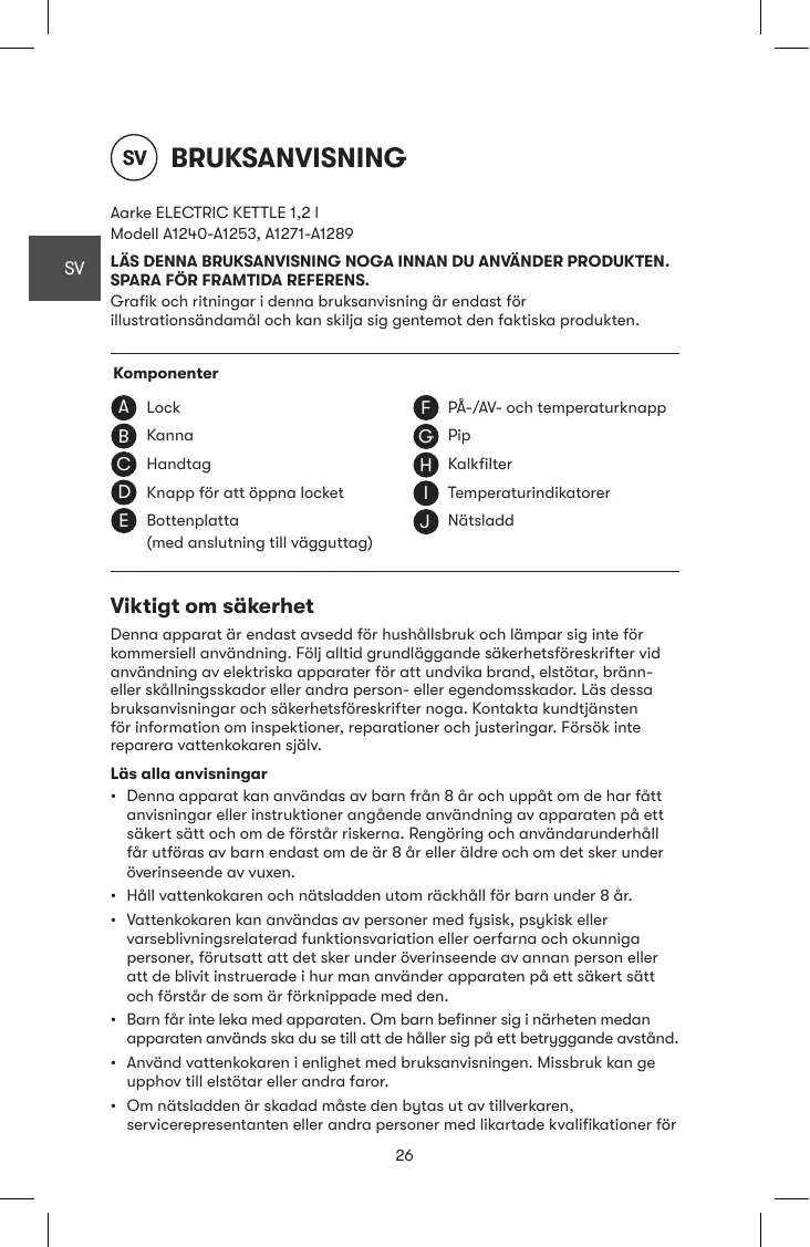 Téléchargez la notice de votre Hushållsapparater au format PDF gratuitement ! Retrouvez votre notice BouilloireNoire - AARKE et reprennez votre appareil électronique en main. Sur cette page sont publiés tous les documents nécessaires à l'utilisation de votre appareil BouilloireNoire de la marque AARKE.