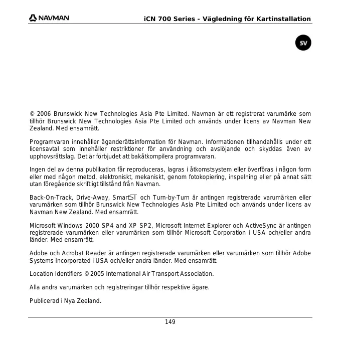 iCN 700 Series - Vägledning för Kartinstallation © 2006 Brunswick New Technologies Asia Pte Limited. Navman är ett registrerat varumärke som tillhör Brunswick New Technologies Asia Pte Limited och används under licens av Navman New Zealand. Med ensamrätt. Programvaran innehåller äganderättsinformation för Navman. Informationen tillhandahålls under ett licensavtal som innehåller restriktioner för användning och avslöjande och skyddas även av upphovsrättslag. Det är förbjudet att bakåtkompilera programvaran. Ingen del av denna publikation får reproduceras, lagras i åtkomstsystem eller överföras i någon form eller med någon metod, elektroniskt, mekaniskt, genom fotokopiering, inspelning eller på annat sätt utan föregående skriftligt tillstånd från Navman. Back-On-Track, Drive-Away, Smart5 och Turn-by-Turn är antingen registrerade varumärken eller varumärken som tillhör Brunswick New Technologies Asia Pte Limited och används under licens av Navman New Zealand. Med ensamrätt. Microsoft Windows 2000 SP4 and XP SP2, Microsoft Internet Explorer och ActiveSync är antingen registrerade varumärken eller varumärken som tillhör Microsoft Corporation i USA och/eller andra länder. Med ensamrätt. Adobe och Acrobat Reader är antingen registrerade varumärken eller varumärken som tillhör Adobe Systems Incorporated i USA och/eller andra länder. Med ensamrätt. Location Identifiers © 2005 International Air Transport Association. Alla andra varumärken och registreringar tillhör respektive ägare. Publicerad i Nya Zeeland.