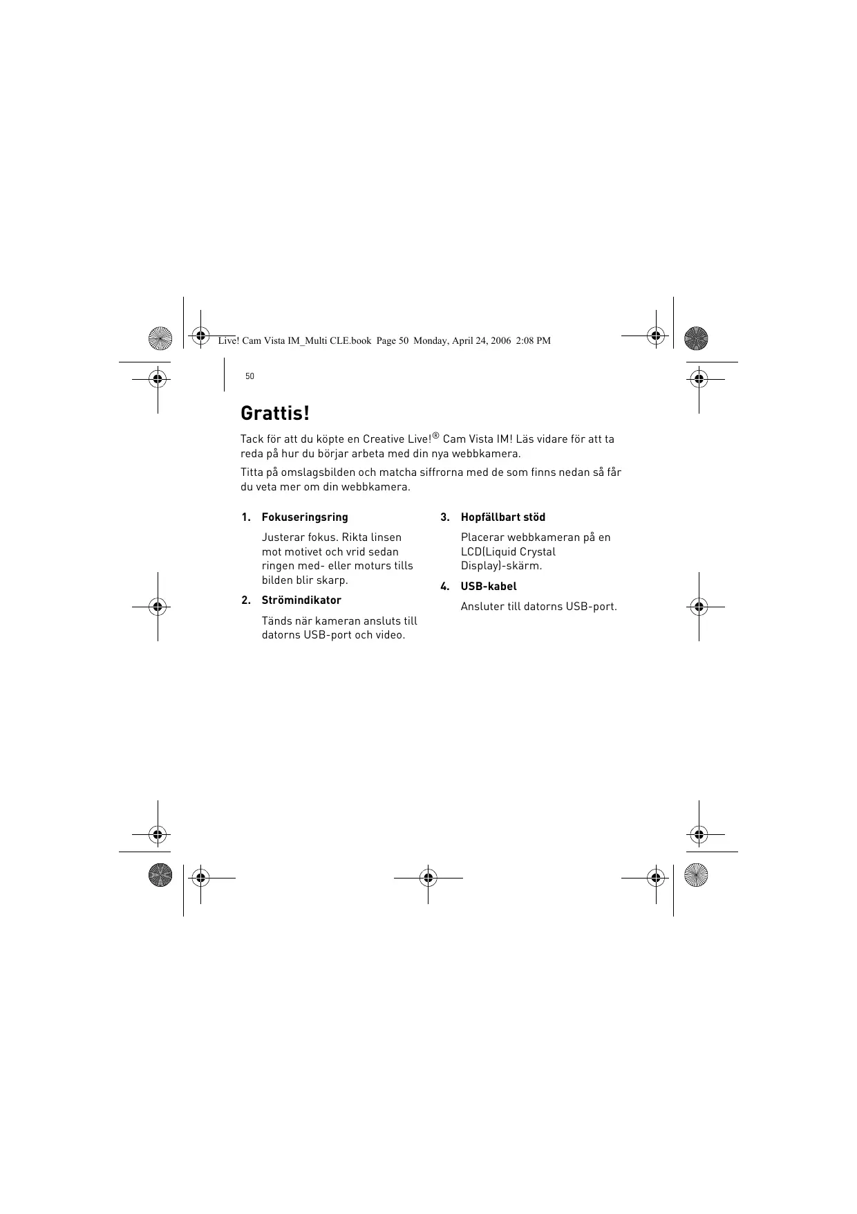 Grattis! Tack för att du köpte en Creative Live!® Cam Vista IM! Läs vidare för att ta reda på hur du börjar arbeta med din nya webbkamera. Titta på omslagsbilden och matcha siffrorna med de som finns nedan så får du veta mer om din webbkamera. 1. Fokuseringsring Justerar fokus. Rikta linsen mot motivet och vrid sedan ringen med- eller moturs tills bilden blir skarp. 2. Strömindikator Tänds när kameran ansluts till datorns USB-port och video.