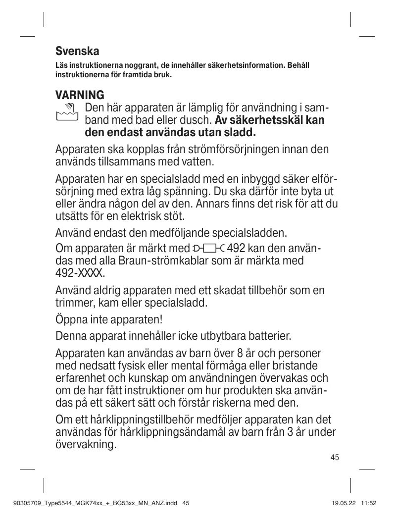 Svenska Läs instruktionerna noggrant, de innehåller säkerhetsinformation. Behåll instruktionerna för framtida bruk. VARNING Den här apparaten är lämplig för användning i samband med bad eller dusch. Av säkerhetsskäl kan den endast användas utan sladd. Apparaten ska kopplas från strömförsörjningen innan den används tillsammans med vatten. Apparaten har en specialsladd med en inbyggd säker elförsörjning med extra låg spänning. Du ska därför inte byta ut eller ändra någon del av den. Annars finns det risk för att du utsätts för en elektrisk stöt. Använd endast den medföljande specialsladden. 492 kan den använOm apparaten är märkt med das med alla Braun-strömkablar som är märkta med 492-XXXX. Använd aldrig apparaten med ett skadat tillbehör som en trimmer, kam eller specialsladd. Öppna inte apparaten! Denna apparat innehåller icke utbytbara batterier. Apparaten kan användas av barn över 8 år och personer med nedsatt fysisk eller mental förmåga eller bristande erfarenhet och kunskap om användningen övervakas och om de har fått instruktioner om hur produkten ska användas på ett säkert sätt och förstår riskerna med den. Om ett hårklippningstillbehör medföljer apparaten kan det användas för hårklippningsändamål av barn från 3 år under övervakning.