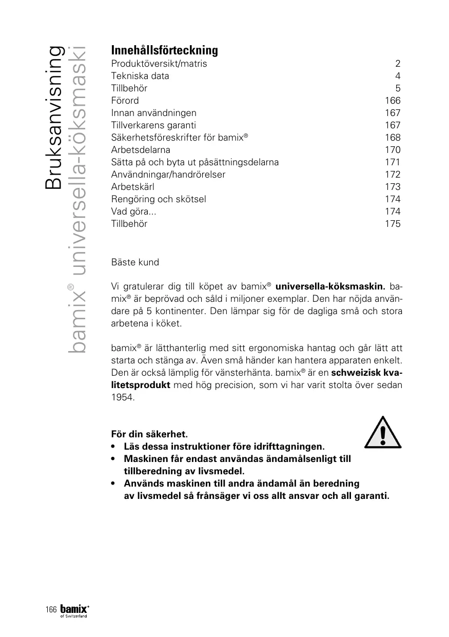 • Lorsque l‘appareil est laissé sans surveillance ou avant son installation, son démontage ou son nettoyage, il faut toujours le débrancher • Ne pas poser l’appareil sur des surfaces chaudes ou à proximité de flammes de gaz, pour éviter que le boîtier ne fonde • L’appareil ne doit être plongé dans un liquide que jusqu’au-dessous de la séparation de la poignée et du boîtier • L’appareil et le capot de protection ne doivent pas être nettoyés dans un lave-vaisselle • Nettoyer l’appareil seulement avec un chiffon humide • Retirez la prise secteur lorsque vous manipulez la coupole de protection ou les accessoires pour nettoyer l’appareil sous l’eau courante ou pour changer un accessoire • N’enclenchez l’appareil qu’après avoir plongé le tube dans le récipient de travail • Le bamix® est doté d’un interrupteur de sécurité prévenant toute mise en service intempestive, et qui arrête instantanément l’appareil dès qu’il est relâché • Si le cable de cet appareil est endommagée, elle devra être remplacée par le fabricant ou son service après-vente ou par une personne possédant des qualifications équivalentes pour éviter tout danger • Débrancher la prise secteur en cas de dérangement lors de l‘utilisation et après l’utilisation • Ne retirez jamais la fiche secteur hors de la prise lorsque vous avez les mains mouillées • Ne porter ni ne tirer jamais l’appareil par son cordon • Le cordon secteur ne doit pas reposer sur des arêtes tranchantes ni être pincé • Evitez de placer le cordon sur des objets chauds ou à proximité de flammes de gaz, et protégez-le de la chaleur et de l’huile • Ne mettez jamais l’appareil en service quand: – l’appareil, son boîtier ou son cordon secteur sont endommagés, – au moindre soupçon de défaut après une chute ou autre circonstance similaire. Dans ce cas, confier l’appareil à notre service de réparation •