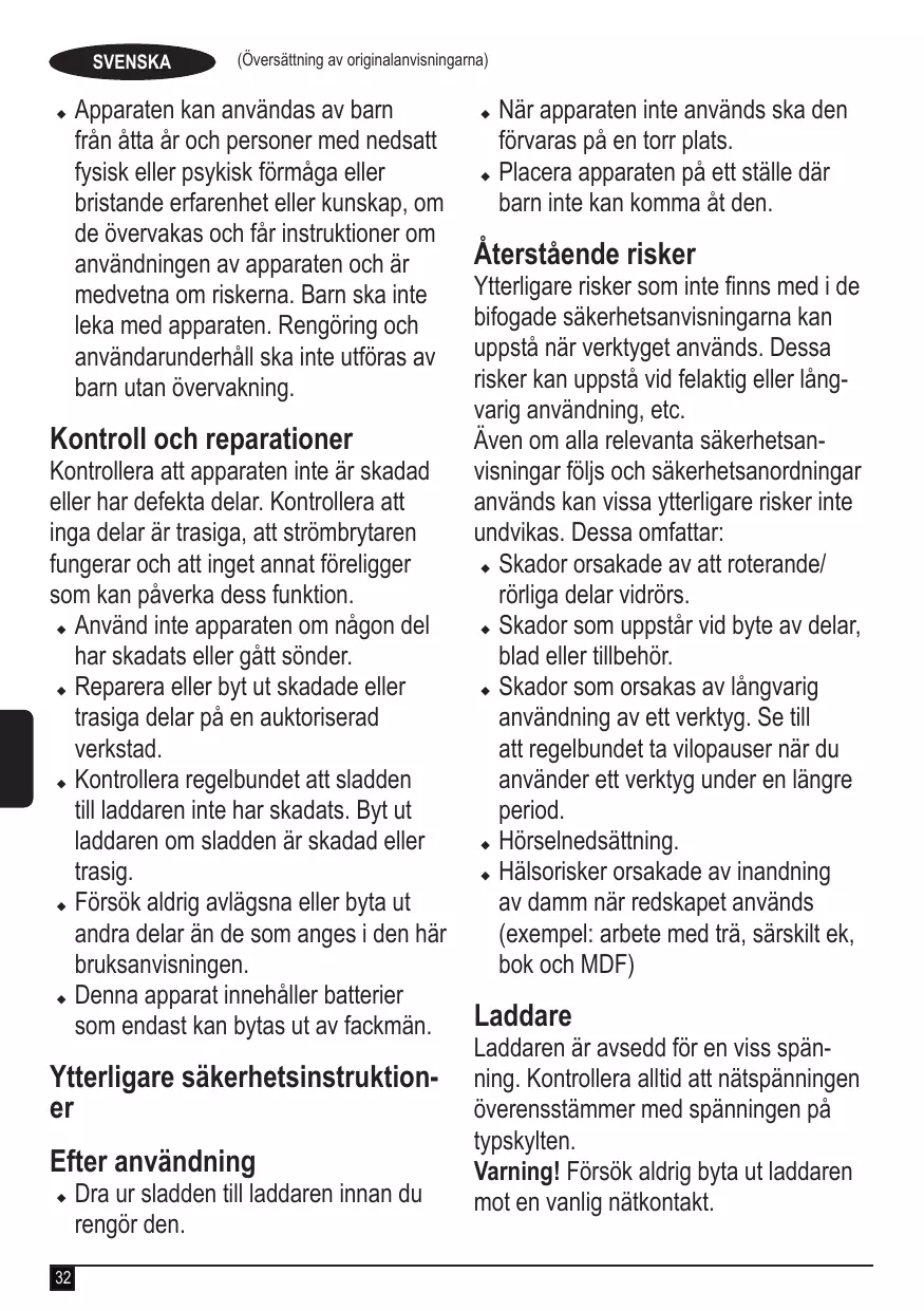 Les blessures dues au contact avec des pièces mobiles/en rotation. Les blessures dues au changement de pièces, de lames ou d’accessoires. Les blessures dues à l’utilisation prolongée d’un outil. Lorsque vous utilisez un outil quel qu’il soit pendant de longues périodes, assurez-vous de faire des pauses régulières. Troubles auditifs. Risques pour la santé dus à l’inhalation de poussières produites pendant l’utilisation de l’outil