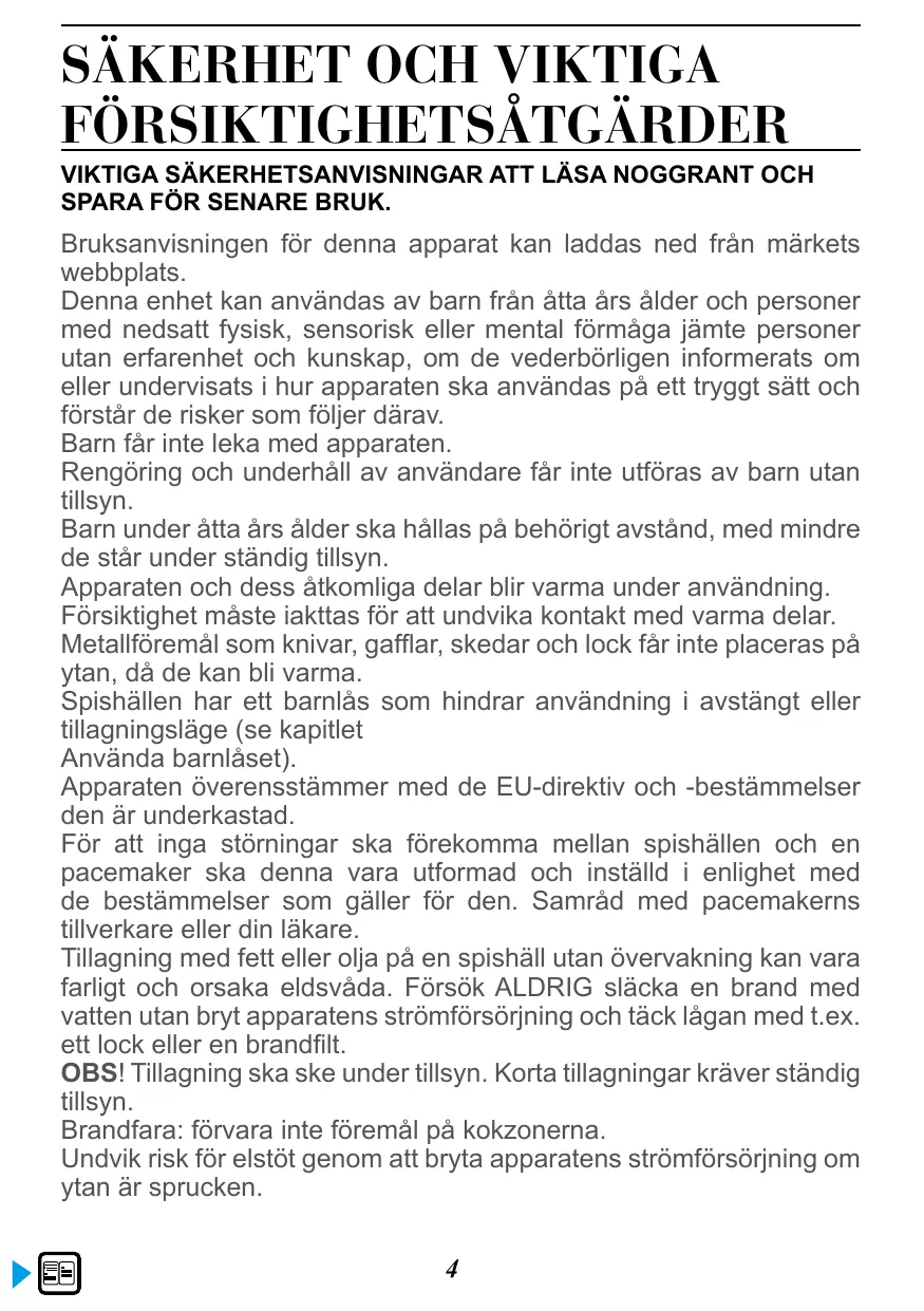 Réglage de la puissance12 Horizone ou duozone 12 Réglage de la minuterie12 Minuteur indépendant 13 Touche ELAPSED TIME13 Verrouillage des commandes 13 Fonction ICS14 Cet appareil peut être utilisé par des enfants âgés de 8 ans et plus et par des personnes ayant des capacités physiques, sensorielles ou mentales réduites ou des personnes sans expérience et connaissance, si elles ont été correctement informées ou formées à l’utilisation de l’appareil en toute sécurité et qu’elles en comprennent les risques qui en résultent. Les enfants ne doivent pas jouer avec l’appareil. Le nettoyage et l’entretien par l’usager ne doivent pas être effectués par des enfants sans surveillance. Les enfants de moins de 8 ans doivent être tenus à l’écart à moins qu’ils ne soient surveillés en permanence. L’appareil et ses parties accessibles deviennent chauds pendant l’utilisation. Des précautions doivent être prises pour éviter de toucher les éléments chauffants. Les objets métalliques tels que couteaux, fourchettes, cuillères et couvercles ne doivent pas être placés sur la surface, car ils peuvent devenir chauds. Votre table possède une sécurité enfant qui verrouille son utilisation à l’arrêt ou en cours de cuisson (voir chapitre: utilisation de la sécurité enfant). Votre appareil est conforme aux directives et réglementations européennes auxquelles il est soumis. Afin qu’il n’y ait pas d’interférences entre votre table de cuisson et un stimulateur cardiaque, ce dernier doit être conçu et réglé en conformité avec la réglementation qui le concerne. Renseignez vous auprès de son fabricant ou votre médecin traitant. Une cuisson avec de l’huile ou de la matière grasse effectuée sur une table, et sans surveillance peut être dangereuse et donner lieu à un incendie. Ne tentez JAMAIS d’éteindre un feu avec de l’eau, mais coupez l’alimentation de l’appareil avant de couvrir la flamme avec par exemple un couvercle ou une couverture anti feu. ATTENTION : la cuisson doit être surveillée. Une cuisson courte nécessite une surveillance continue. Risque d’incendie : ne pas stocker d’objets sur les zones de cuisson. Si la surface est fissurée, déconnecter l’appareil pour éviter le risque de choc électrique. 4