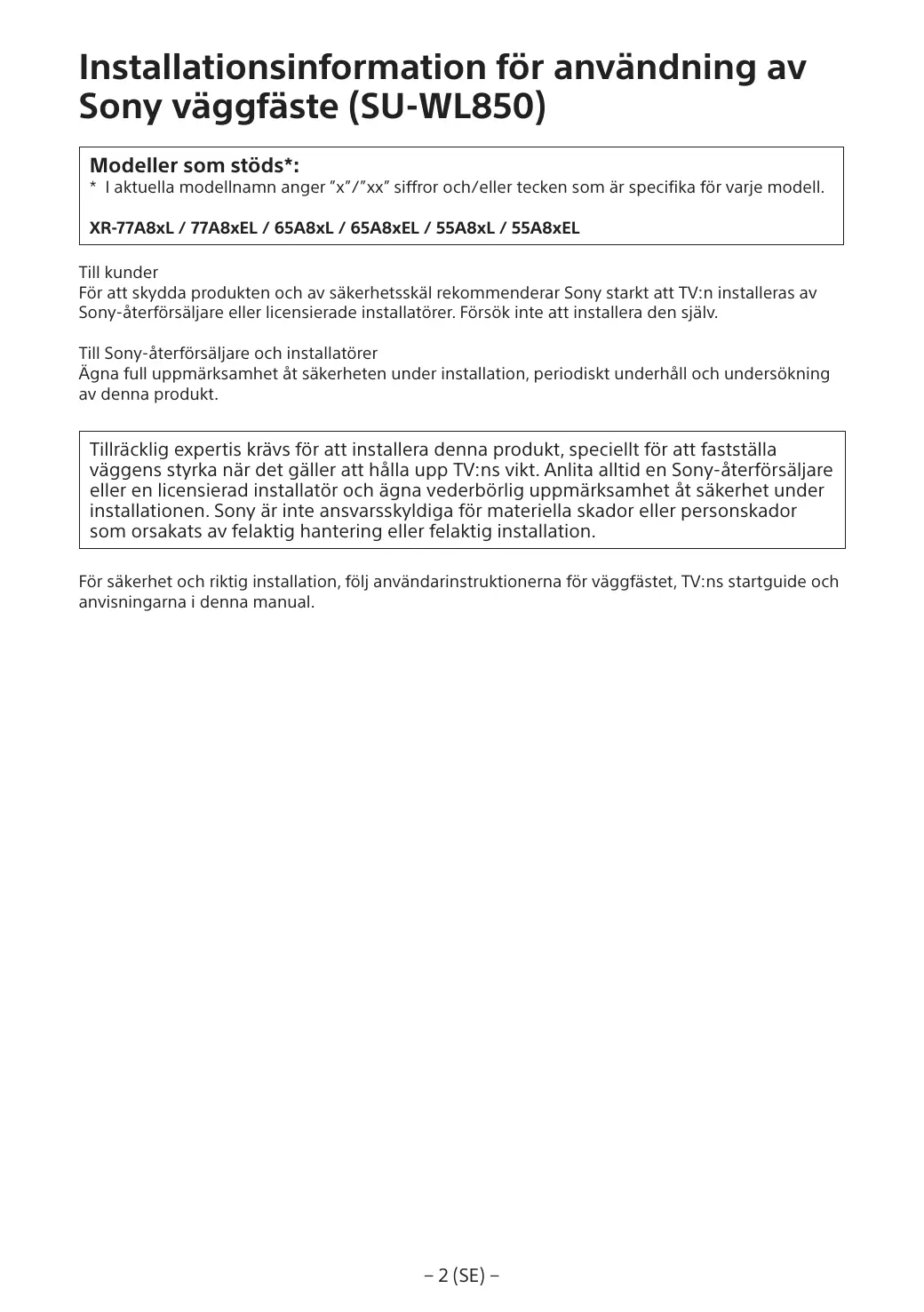 AVERTISSEMENT INSTALLATION PAR UN PROFESSIONNEL REQUISE Ce produit doit être installé exclusivement par un installateur professionnel ayant été formé pour déterminer la résistance du mur qui devra soutenir le poids du téléviseur. S’il est mal fixé lors de son installation, le téléviseur peut tomber et provoquer des blessures graves. Sony ne saurait être tenue responsable de tout dommage ou de toute blessure découlant d’une mauvaise utilisation ou d’une installation incorrecte, ou encore de l’installation d’un produit autre que celui spécifié. Vos droits légaux (éventuels) ne sont pas affectés.