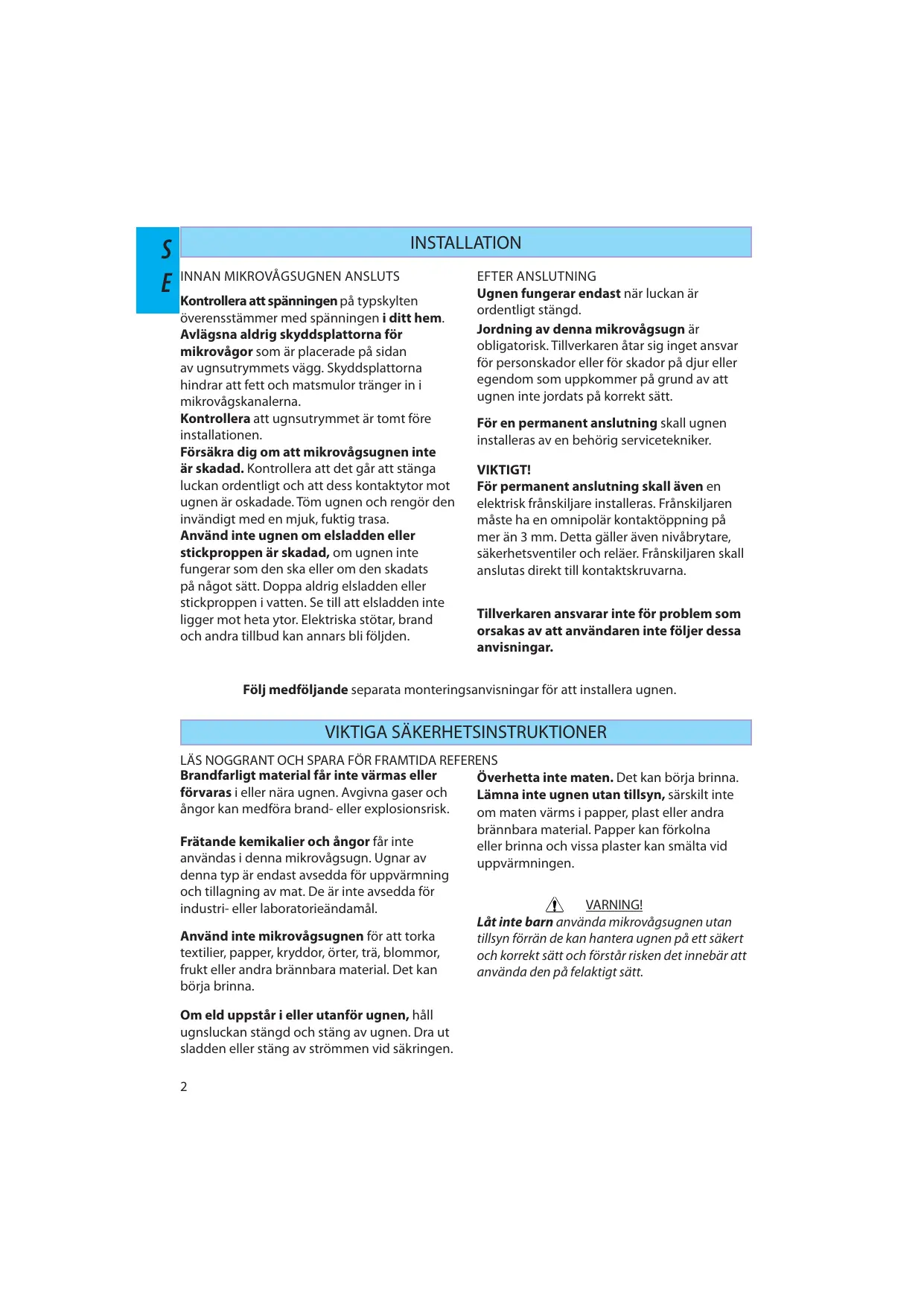 VIKTIGA SÄKERHETSINSTRUKTIONER