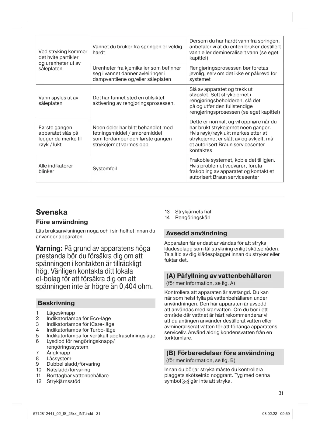 (B) Förberedelser före användning (för mer information, se fig. B) Innan du börjar stryka måste du kontrollera plaggets skötselråd noggrant. Tyg med denna går inte att stryka. symbol 31
