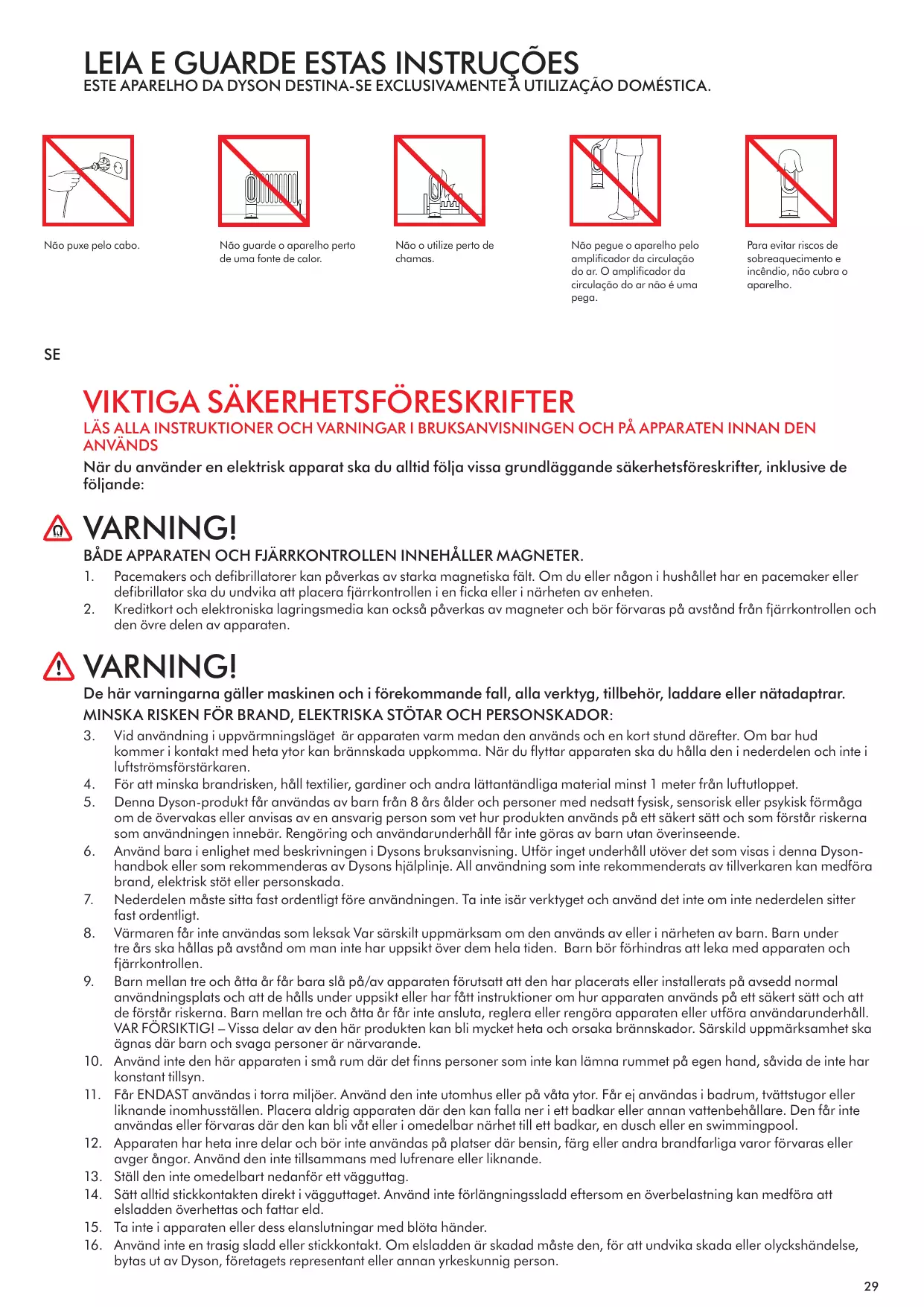 3. Cet appareil Dyson peut être utilisé par les enfants à partir de 8 ans et les personnes dont les capacités physiques, sensorielles ou mentales sont réduites, ou manquant d’expérience ou de connaissances, uniquement s’ils sont supervisés ou qu’ils ont reçu des instructions de la part d’une personne responsable concernant l’utilisation de l’appareil en toute sécurité, et qu’ils comprennent les dangers associés. Le nettoyage et l’entretien ne doivent pas être réalisés par des enfants non supervisés. Utilisez l’appareil uniquement tel que décrit dans le manuel de l’utilisateur Dyson.N’effectuez pas de travaux d’entretien autres que ceux indiqués dans ce mode d’emploi Dyson ou que ceux conseillés par le Service consommateurs Dyson. Toute autre utilisation non recommandée par le fabricant peut entraîner un incendie, une décharge électrique ou des blessures. La base doit être solidement fixée avant que l’appareil soit mis en marche. Ne démontez pas l’appareil et ne l’utilisez pas si la base n’est pas fixée. Cet appareil n’est pas un jouet. Faites preuve de prudence lorsqu’il est utilisé par des enfants ou à proximité d’enfants. Ne laissez pas l’appareil à proximité d’enfants de moins de 3 ans à moins qu’ils ne soient constamment sous surveillance. Surveillez les enfants pour vous assurer qu’ils ne jouent pas avec l’appareil ou la télécommande. Les enfants âgés de 3 ans à 8 ans ne peuvent allumer/éteindre l’appareil que s’il a été placé ou installé dans sa position normale d’utilisation et s'ils sont supervisés ou ont reçu des instructions concernant l’utilisation de l’appareil en toute sécurité, et qu’ils comprennent les risques encourus. Les enfants âgés de 3 ans à moins de 8 ans ne doivent pas brancher l’appareil, le régler ou le nettoyer, et ne doivent pas réaliser les opérations de maintenance à la charge de l’utilisateur. ATTENTION – Certains éléments de ce produit peuvent devenir très chauds et provoquer des brûlures. Faites particulièrement attention en présence d’enfants ou de personnes vulnérables. N’utilisez pas cet appareil dans des petites pièces dans lesquelles se trouvent des personnes incapables d’en sortir par leurs propres moyens, à moins qu’elles ne soient constamment sous surveillance. Convient UNIQUEMENT aux environnements secs. N’utilisez pas cet appareil en extérieur ou sur des surfaces humides. Ne l’utilisez pas dans des salles de bain, des buanderies ou d'autres pièces similaires. Ne placez jamais l’appareil à un endroit où il risque de tomber dans une baignoire ou un autre récipient contenant de l’eau. N’utilisez pas l’appareil et ne le rangez pas à un endroit où il risque d’être mouillé ou à proximité immédiate d’une baignoire, d’une douche ou d’une piscine. Cet appareil contient des éléments chauds. Ne l’utilisez pas dans des endroits dans lesquels du pétrole, de la peinture ou des liquides inflammables sont utilisés ou entreposés, ou dans des endroits dans lesquels leurs vapeurs sont présentes. N’utilisez pas cet appareil en association avec un désodorisant ou produit similaire, ou directement à proximité d’un tel produit. Ne placez pas l’appareil directement au-dessous d’une prise de courant. Branchez toujours l’appareil directement sur une prise murale. N’utilisez jamais de rallonge ; une surcharge risquerait d’entraîner une surchauffe du cordon d’alimentation et l’embrasement de celui-ci. Ne manipulez aucune partie de la prise ou de l’appareil avec les mains mouillées. N’utilisez pas l’appareil si la prise ou le cordon sont endommagés. Si le cordon d’alimentation est endommagé, il doit être remplacé par Dyson, l'un de ses agents ou l'une des personnes agréées afin d’éviter tout danger. Ne débranchez pas l’appareil en tirant sur le cordon d’alimentation. Pour le débrancher, saisissez la prise et non pas le cordon. N’étirez pas le cordon et n’exercez pas de tension dessus. Éloignez le cordon des surfaces chaudes. Ne faites pas passer le cordon sous des meubles ou des appareils. Ne recouvrez pas le cordon par des tapis ou autres articles de ce type. Ne laissez pas le cordon dans le passage pour éviter tout risque de chute. Pour éviter tout risque d’incendie, n’utilisez pas l’appareil en cas d’obstruction d’une ouverture ou d’une sortie. Assurez-vous que rien ne réduit le flux d’air : poussière, peluches, cheveux ou autre. Ne placez aucun objet dans la grille d’entrée d’air ou les ouvertures de sortie pour éviter de provoquer une décharge électrique ou un incendie, ou d’endommager l’appareil. N’utilisez pas l’appareil sur une surface souple, comme un lit, où les ouvertures risquent d’être obstruées. Utilisez toujours cet appareil sur une surface horizontale et stable. Pour éviter toute surchauffe ou tout risque d’incendie, ne couvrez pas l’appareil. Pour des performances optimales, placez l’appareil sur le sol, dans un coin de la pièce, à au moins 1 m des murs et dirigez-le vers le centre de la pièce. Placez toutes les commandes sur arrêt avant de débrancher l’appareil. N’utilisez pas d’agents de nettoyage ou de lubrifiants sur cet appareil. Débranchez l’appareil avant de le nettoyer ou de procéder à tout entretien. En cas de jeu entre la fiche et la prise de courant ou si la fiche devient très chaude, il se peut que la prise de courant doive être remplacée. Consultez un électricien qualifié pour le remplacement de la prise de courant. Risque de brûlure chimique et d’étouffement. Conservez les piles hors de portée des enfants. Ce produit contient une pile bouton lithium. L’ingestion ou l’insertion dans une partie du corps d’une pile bouton lithium neuve ou usagée peut provoquer de graves brûlures internes et entraîner le décès en 2 heures à peine. Veillez t