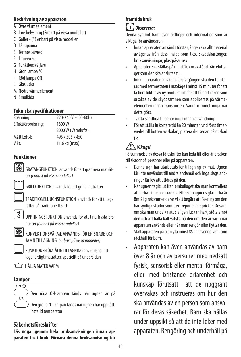 Son cordon d’alimentation est défectueux L’appareil est tombé ou s’il présente des dégâts visibles ou des anomalies de fonctionnement. Le cas échéant, afin d’éviter tout risque, faites-le vérifier par le Centre de Service Après-vente le plus proche. N’installez pas l’appareil à proximité de sources de chaleur. N’utilisez pas l’appareil comme source de chaleur. Ne mettez jamais de papier, carton ou plastique dans le four et ne posez jamais rien dessus (ustensiles, grilles ou autres objets). N’introduisez rien dans les bouches de ventilation. Veillez à ne pas les obstruer. Ce four n’est pas conçu pour être encastré. Une fois la porte ouverte, n’y appuyez jamais des objets lourds, des casseroles ou récipients brûlants. Ne tirez pas la poignée vers le bas.