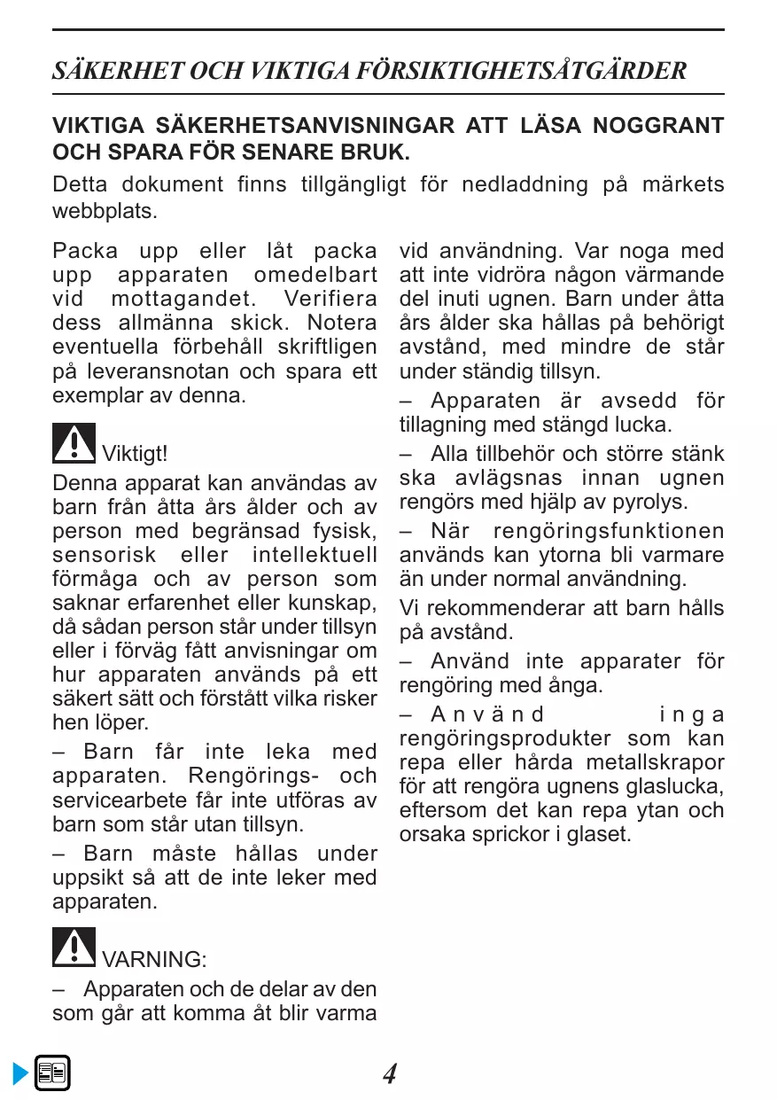 Viktigt! Denna apparat kan användas av barn från åtta års ålder och av person med begränsad fysisk, sensorisk eller intellektuell förmåga och av person som saknar erfarenhet eller kunskap, då sådan person står under tillsyn eller i förväg fått anvisningar om hur apparaten används på ett säkert sätt och förstått vilka risker hen löper. – Barn får inte leka med apparaten. Rengörings- och servicearbete får inte utföras av barn som står utan tillsyn. – Barn måste hållas under uppsikt så att de inte leker med apparaten. VARNING: – Apparaten och de delar av den som går att komma åt blir varma
