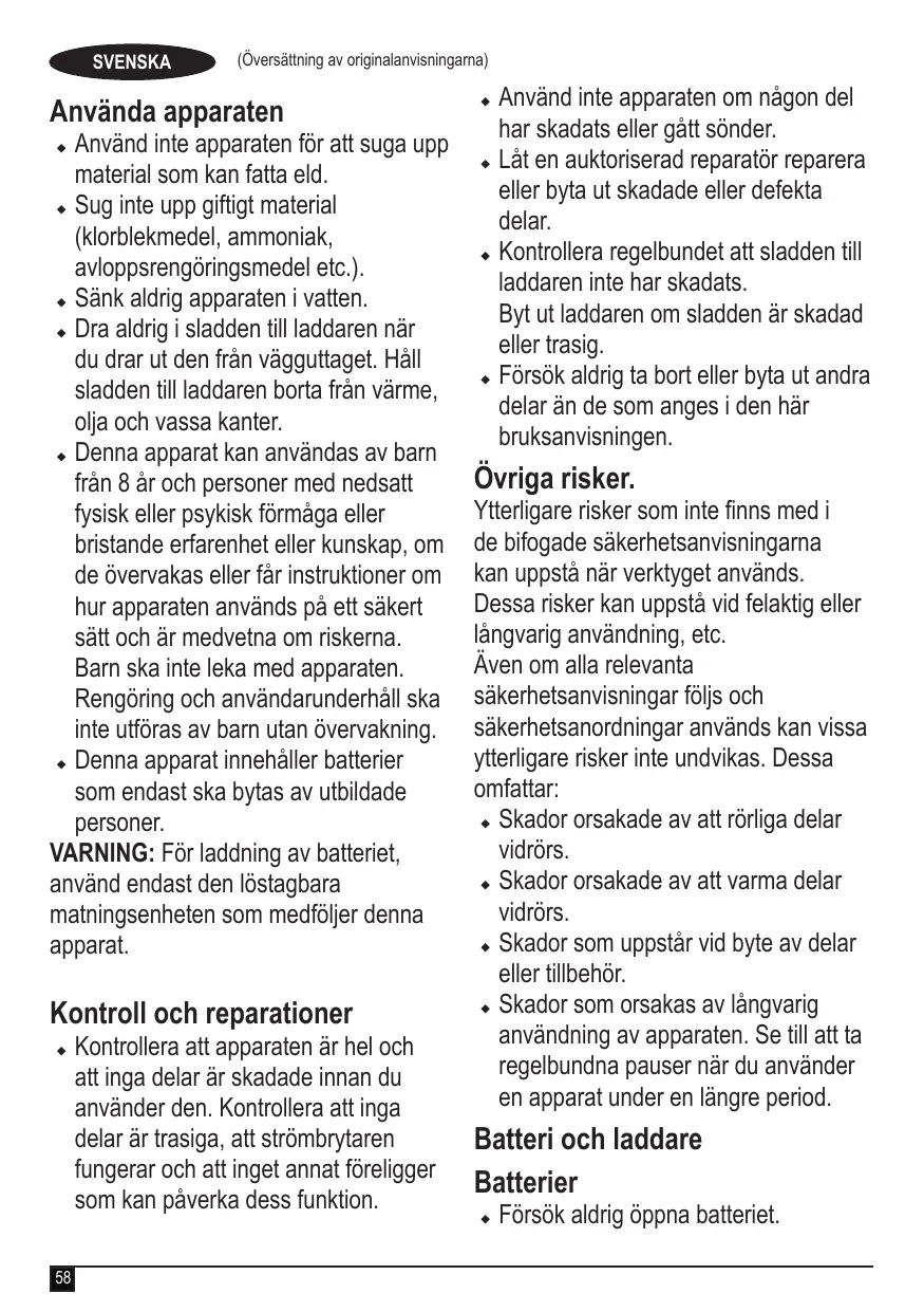 Använd inte apparaten för att suga upp material som kan fatta eld. u Sug inte upp giftigt material (klorblekmedel, ammoniak, avloppsrengöringsmedel etc.). u Sänk aldrig apparaten i vatten. u Dra aldrig i sladden till laddaren när du drar ut den från vägguttaget. Håll sladden till laddaren borta från värme, olja och vassa kanter. Denna apparat kan användas av barn från 8 år och personer med nedsatt fysisk eller psykisk förmåga eller bristande erfarenhet eller kunskap, om de övervakas eller får instruktioner om hur apparaten används på ett säkert sätt och är medvetna om riskerna. Barn ska inte leka med apparaten. Rengöring och användarunderhåll ska inte utföras av barn utan övervakning. u Denna apparat innehåller batterier som endast ska bytas av utbildade personer. VARNING: För laddning av batteriet, använd endast den löstagbara matningsenheten som medföljer denna apparat. u