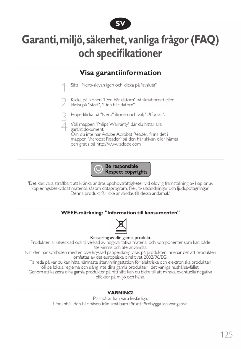 Hur du gör en dataskiva Hur du gör en audioskiva Garanti, miljö, säkerhet, vanliga frågor (FAQ) och specifikationer
