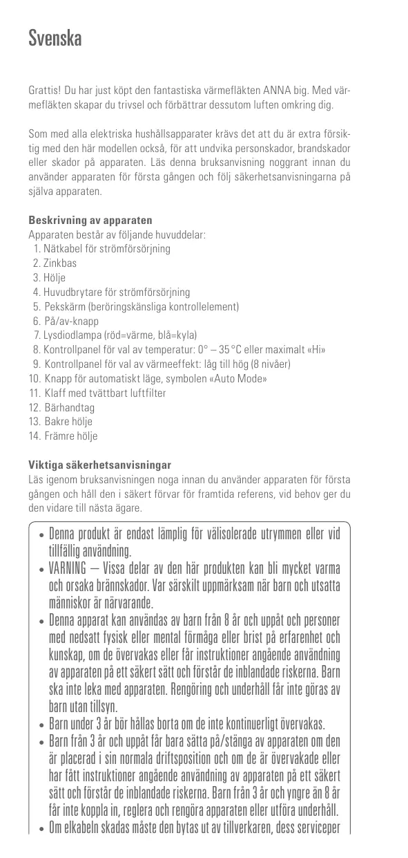 Téléchargez la notice de votre Uppvärmning au format PDF gratuitement ! Retrouvez votre notice BIG BLANC - ANNA et reprennez votre appareil électronique en main. Sur cette page sont publiés tous les documents nécessaires à l'utilisation de votre appareil BIG BLANC de la marque ANNA.