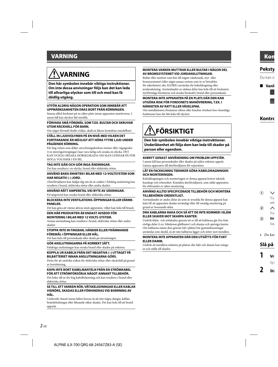 INSTALLATIONSDATUM: INSTALLATIONSTEKNIKER: INKÖPSSTÄLLE: Se bruksanvisningen som finns på vår webbplats för mer information om alla funktioner: http://www.alpine-europe.com. En ALPINE-återförsäljare förser dig, vid behov med en tryckt kopia av bruksanvisningen som finns på vår webbplats. 1-SE ALPINE iLX-700 QRG 68-24567Z83-A (SE) VARNING VARNING Den här symbolen innebär viktiga instruktioner. Om inte dessa anvisningar följs kan det kan leda till allvarliga olyckor som till och med kan få dödlig utgång. UTFÖR ALDRIG NÅGON OPERATION SOM INNEBÄR ATT UPPMÄRKSAMHETEN DRAS BORT FRÅN KÖRNINGEN. Stanna alltid fordonet på en säker plats innan apparaten manövreras. I annat fall kan olyckor lätt inträffa. FÖRVARA SMÅ FÖREMÅL SOM T.EX. BULTAR OCH SKRUVAR UTOM RÄCKHÅLL FÖR BARN. Om något föremål skulle sväljas, skall en läkare kontaktas omedelbart. STÄLL IN LJUDVOLYMEN PÅ EN NIVÅ MED VILKEN DET FORTFARANDE ÄR MÖJLIGT ATT HÖRA YTTRE LJUD UNDER PÅGÅENDE KÖRNING. För hög volym som döljer utryckningsfordons sirener eller vägsignaler (t ex järnvägsövergångar) kan vara farlig och orsaka en olycka. DET KAN OCKSÅ ORSAKA HÖRSELSKADA OM MAN LYSSNAR PÅ FÖR HÖGA VOLYMER I EN BIL. TAG INTE ISÄR OCH GÖR INGA ÄNDRINGAR. Det kan resultera i en olycka, brand eller elektriska stötar. ANVÄND BARA ENHETEN I BILAR MED 12-VOLTSYSTEM SOM HAR NEGATIV (–) JORD. (Återförsäljaren kan hjälpa dig om du är osäker.) Felaktig anslutning kan resultera i brand, elektriska stötar eller andra skador. ANVÄND RÄTT AMPERETAL VID BYTE AV SÄKRINGAR. Kom MONTERA VARKEN MUTTRAR ELLER BULTAR I NÅGON DEL AV BROMSSYSTEMET VID JORDANSLUTNINGAR. Peksty Bultar eller muttrar som hör till någon vätsketank, styr- eller bromssystemet (eller något annan system som är av betydelse för säkerheten) ska ALDRIG användas för kabeldragning eller jordanslutning. Användandet av sådana delar kan leda till att fordonets styrförmåga försämras och orsaka bromsfel, brand eller personskada. Du kan st MONTERA INTE APPARATEN PÅ EN PLATS DÄR DEN KAN UTGÖRA RISK FÖR FORDONETS MANÖVRERING, T.EX. I NÄRHETEN AV RATT ELLER VÄXELSPAK. Om installationen försämrar sikten eller hindrar rörelsen hos väsentliga funktioner kan det lätt leda till olyckor. Kontro FÖRSIKTIGT Den här symbolen innebär viktiga instruktioner. Underlåtenhet att följa dem kan leda till skador på person eller egendom. AVBRYT GENAST ANVÄNDNING OM PROBLEM UPPSTÅR. I annat fall kan personskador eller skador på själva enheten uppstå. Lämna apparaten till återförsäljaren för reparation. LÅT EN FACKKUNNIG TEKNIKER GÖRA KABELDRAGNINGEN OCH MONTERINGEN. Kabeldragningen och monteringen av denna apparat kräver teknisk kunskap och erfarenhet. Kontakta återförsäljaren, som sålde apparaten, för utförandet av säker montering. Fel amperetal kan orsaka brand eller elektriska stötar. ANVÄND ALLTID SPECIFICERADE TILLBEHÖR OCH MONTERA TILLBEHÖREN ORDENTLIGT. BLOCKERA INTE VENTILATIONS-ÖPPNINGAR ELLER VÄRMEPANELER. Det kan göra att värme alstras inuti apparaten, vilket kan leda till brand. Användandet av andra delar än som är avsedda för denna apparat kan leda till att apparaten skadas invändigt eller till ostadig montering på grund av lossnande delar. DEN HÄR PRODUKTEN ÁR ENDAST AVSEDD FÖR MONTERING I BILAR MED 12 VOLTS-SYSTEM. DRA KABLARNA RAKA OCH SÅ ATT DE INTE KOMMER I KLÄM ELLER SKAVER MOT SKARPA KANTER. Annan användning kan resultera i brand, elektriska stötar eller andra skador. Undvik kläm- och nötskador genom att se till att kablarna går fria från rörliga delar (t.ex. bilsätenas glidbanor) och skarpa och spetsiga kanter. Om kablarna måste dras genom hål i plåten bör gummibussningar användas som skydd, så att inte kablarna ligger och nöter mot metallen. STOPPA INTE IN FINGRAR, HÄNDER ELLER FRÄMMANDE FÖREMÅL I ÖPPNINGAR ELLER HÅL. Det kan leda till personskada eller skada på utrustningen. GÖR ANSLUTNINGARNA PÅ KORREKT SÄTT. Felaktiga anslutningar kan orsaka brand eller skador på enheten. KOPPLA UR KABELN FRÅN DET NEGATIVA (–) UTTAGET PÅ BILBATTERIET INNAN ANSLUTNINGARNA GÖRS. Detta för att undvika risken för elektriska stötar eller olycksfall på grund av kortslutning. KAPA INTE BORT KABELMANTELN FRÅN EN STRÖMKABEL FÖR ATT STRÖMFÖRSÖRJA NÅGOT ANNANT TILLBEHÖR. Det leder till en för hög kabelbelastning och kan resultera i brand eller elektriska stötar. SE TILL ATT VARKEN RÖR, VÄTSKELEDNINGAR ELLER KABLAR VIDRÖRS, SKADAS ELLER FÖRHINDRAS VID BORRNING AV HÅL. Undersök chassit innan hålen borras så att inte några slangar, kablar, bränsleledningar eller liknande råkar skadas. Det kan leda till att brand uppstår. 2-SE ALPINE iLX-700 QRG 68-24567Z83-A (SE) e Vanli MONTERA INTE APPARATEN DÄR DEN UTSÄTTS FÖR FUKT ELLER DAMM. Undvik att installera enheten på platser där fukt och damm kan tränga in och ställa till skador.
