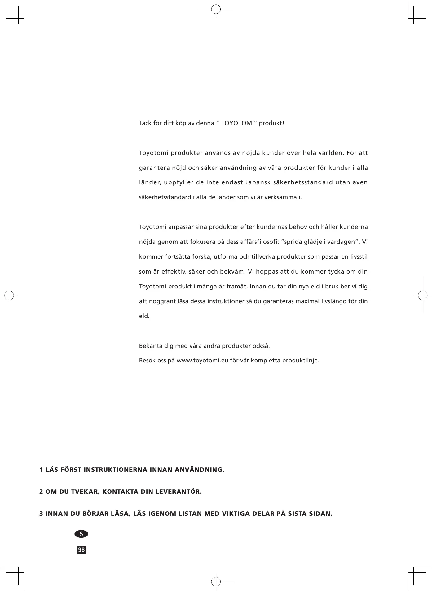 Toyotomi anpassar sina produkter efter kundernas behov och håller kunderna nöjda genom att fokusera på dess affärsfilosofi: ”sprida glädje i vardagen”. Vi kommer fortsätta forska, utforma och tillverka produkter som passar en livsstil som är effektiv, säker och bekväm. Vi hoppas att du kommer tycka om din Toyotomi produkt i många år framåt. Innan du tar din nya eld i bruk ber vi dig att noggrant läsa dessa instruktioner så du garanteras maximal livslängd för din eld.