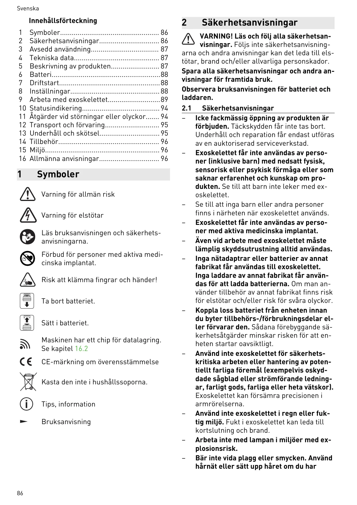 – Está prohibido abrir la herramienta de manera indebida. No está permitido reti rar las cubiertas de protección. El manteni miento y la reparación solo deben llevarse a cabo en un taller especializado autoriza do. – El exoesqueleto no debe ser utilizado por personas (incluidos los niños) que por razones físicas, sensoriales o psíquicas, inexperiencia o desconocimiento no estén capacitadas para su uso. Evite que los ni ños jueguen con el exoesqueleto. Peligro de aplastamiento de dedos y manos Extraer la batería. Insertar la batería. La herramienta cuenta con un chip pa ra el almacenamiento de datos. Ver apartado 16.2 Marcado CE de conformidad No depositar en la basura doméstica. Consejo, indicación Guía de procedimiento