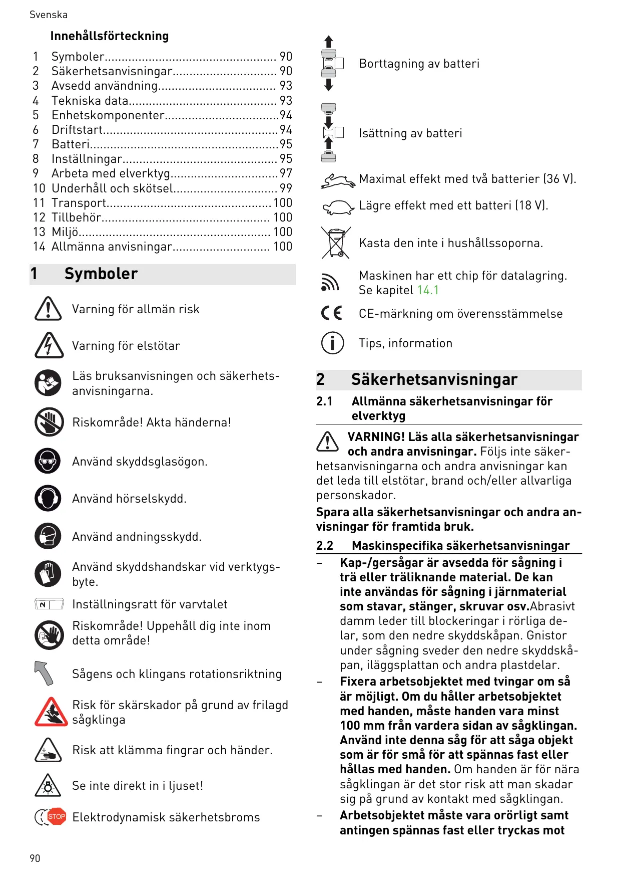 Remplacez les butées détériorées par la lame de scie ou endommagées. Les bu­ tées endommagées risquent d'être proje­ tées lors de l'utilisation de la scie. Les personnes situées à proximité peuvent être blessées. Ne jamais mettre la main dans l'ouverture d'éjection des copeaux. Les pièces en rota­ tion peuvent entraîner des blessures des mains. Pendant l'utilisation, des poussières dan­ gereuses pour la santé peuvent être dé­ gagées (par ex. dans le cas des revête­ ments au plomb ou de certaines essences de bois). Le contact ou l'inhalation de ces poussières peut présenter un danger pour la santé de l'utilisateur ou des personnes se trouvant à proximité. Veuillez respecter les prescriptions de sécurité en vigueur dans votre pays. Pour protéger votre santé, portez une protection respiratoire appropriée. Dans les espaces clos, assurer une ventilation suffisante et raccorder un aspirateur. Utiliser l'outil électroportatif uniquement à l'intérieur et dans un environnement sec. Pour faire fonctionner l'outil électroporta­ tif sans fil, servez-vous uniquement des batteries prévues à cette fin et n'utilisez jamais de blocs d'alimentation. N'utilisez pas de chargeurs d'autres fabricants pour recharger les batteries. L'utilisation d'ac­ cessoires autres que ceux prévus par le fa­ bricant peut provoquer une décharge élec­ trique et/ou des accidents graves. Vérifiez si des éléments du carter pré­ sentent des dommages (fissures, fendille­ ments, etc.). Faites réparer les parties en­ dommagées avant d'utiliser l'outil électro­ portatif. Ne vous placez jamais sur la table de scia­ ge et ne l'utilisez pas comme marchepied. La table de sciage et les roulettes pivotan­ tes ou les pieds additionnels disponibles en option pourraient se tordre. Ceci augmen­ terait le risque de recul dangereux.